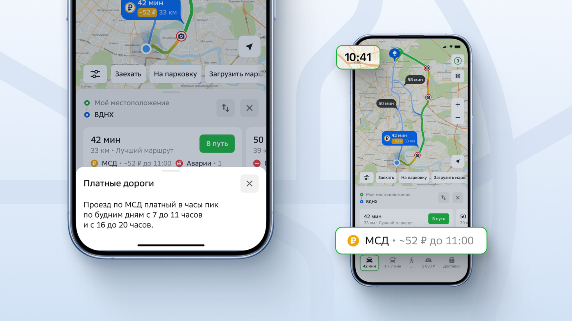 Пользователям, включившим настройку «Избегать платных дорог», навигатор будет прокладывать маршрут через МСД только в то время, когда проехать по магистрали можно бесплатно.
