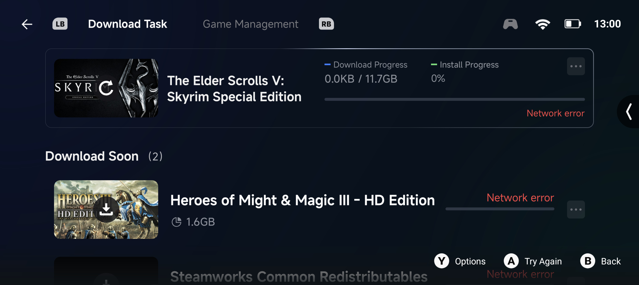 А иногда загрузка и без того тяжёлых игр и вовсе прерывается странным сообщением Network error, после которого необходимо возобновлять установку всех тайтлов вручную.