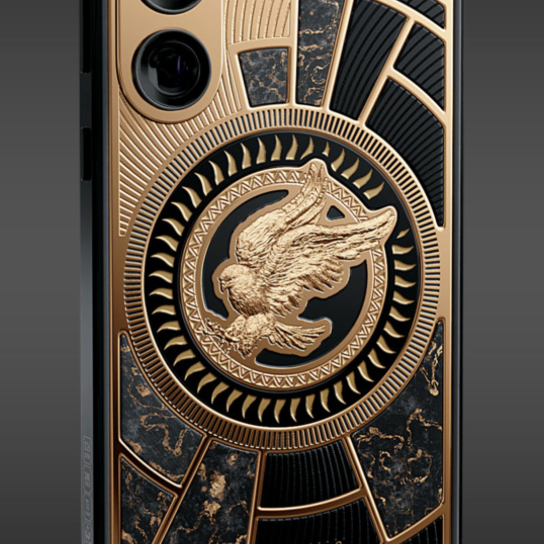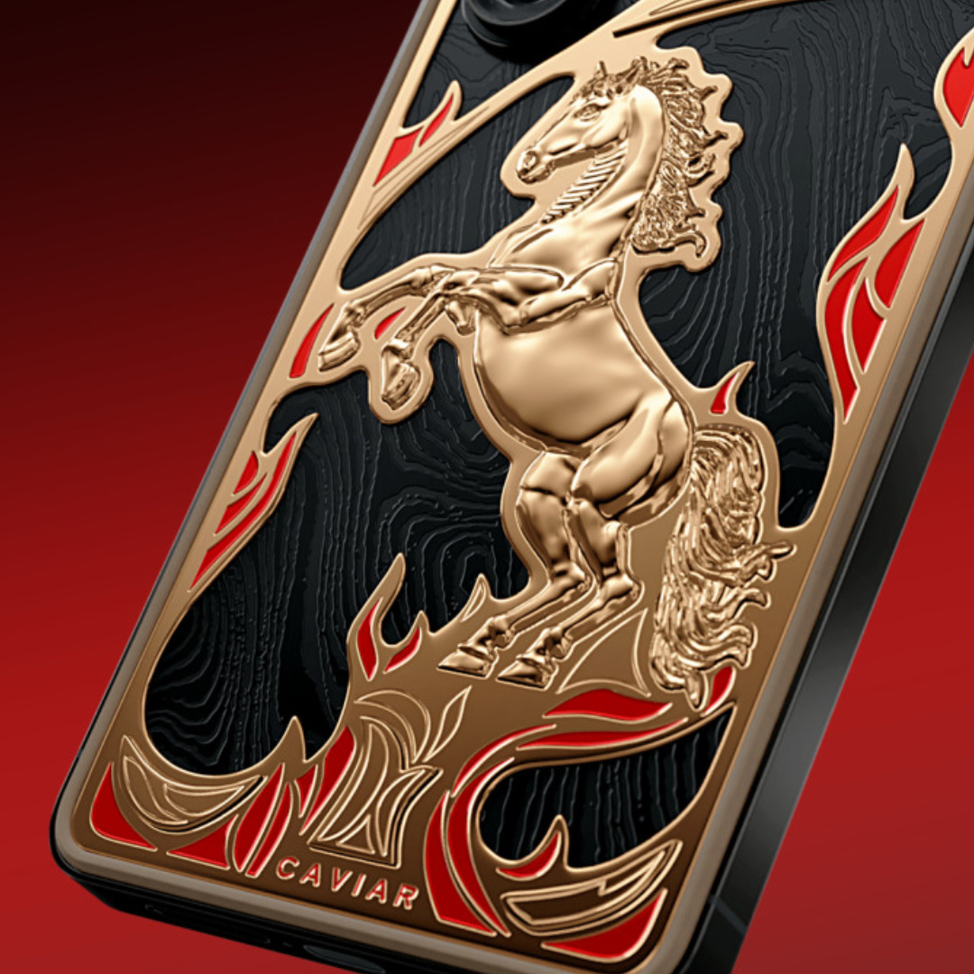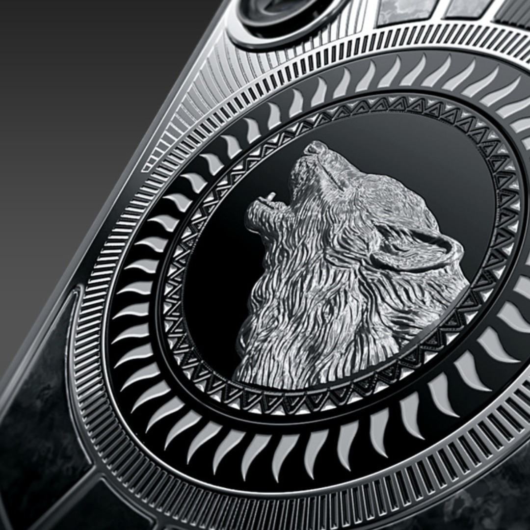 Вместе с титановой крышкой Caviar нашла место вставочкам из кованого карбона, нанесла ювелирную эмаль и задизайнила барельеф с двойным золотым покрытием для лошади, сокола и льва.