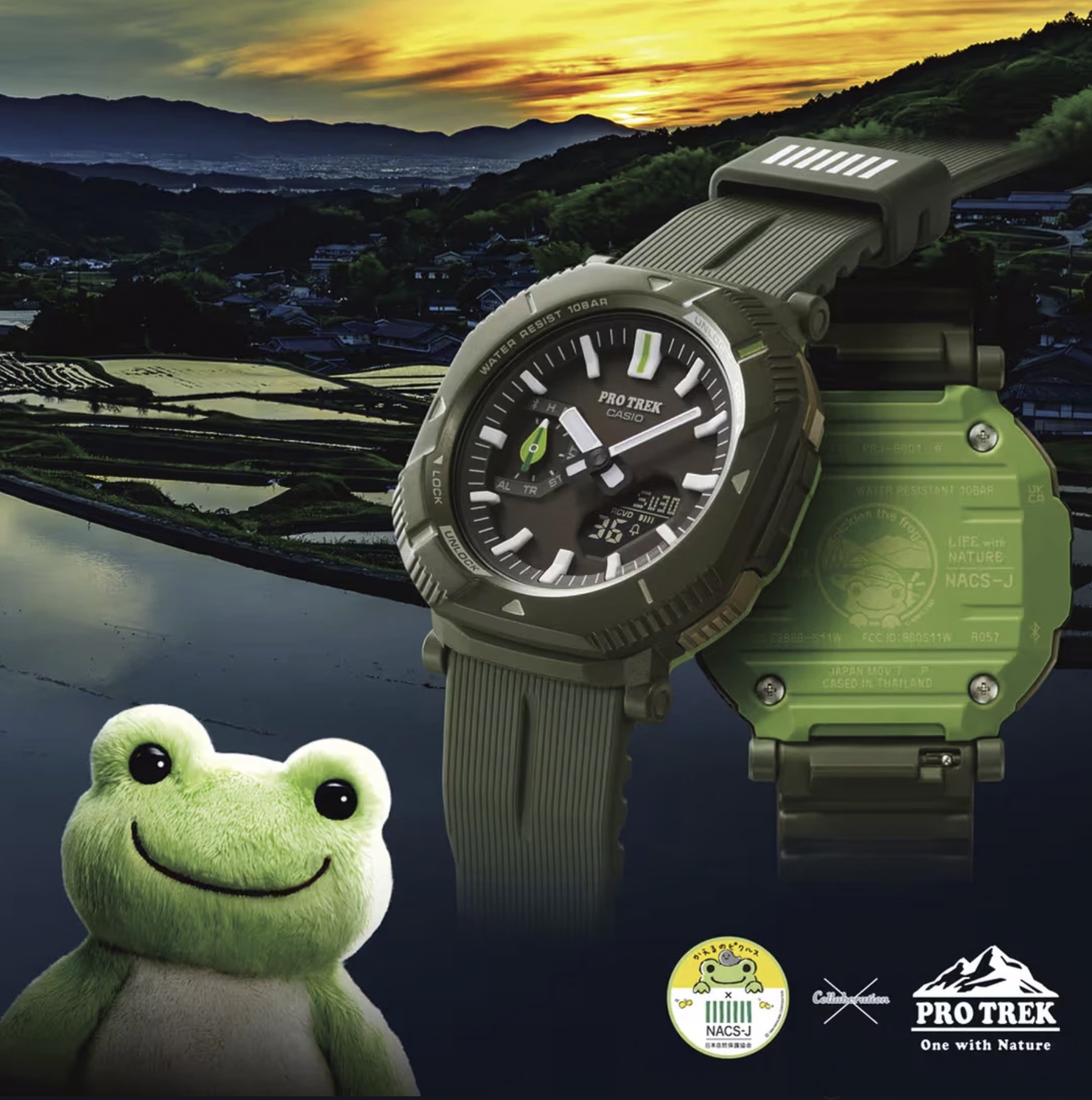 Вот что написано на сайте g-store: «Перед вами суперредкий релиз 2026 года — аналого-цифровая модель PRO TREK из серии PRJ-B001 в зелёной расцветке явилась результатом тройной коллаборации: бренда Casio, Японского общества охраны природы (NACS-J) и Лягушонка Пиклза (Pickles the Frog)!».