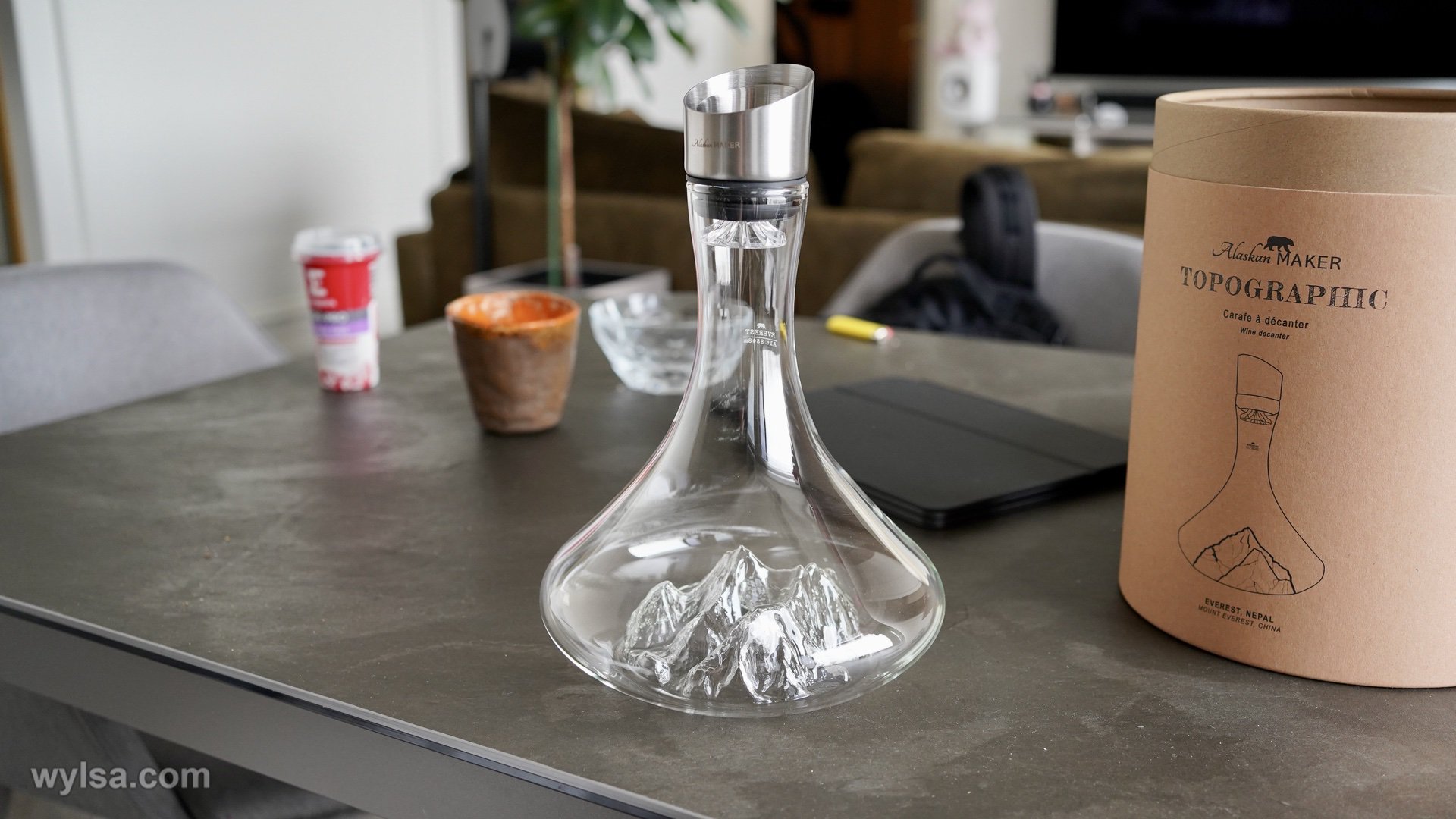Друзяки из Bag&Wallet постоянно расширяют ассортимент, заехал глянуть рюкзак в подарок, в итоге ушёл с декантером. Фирма Alskan делает много всего интересного из стекла, фирменная фишка — горы на донышке, в моём декантере Эверест.