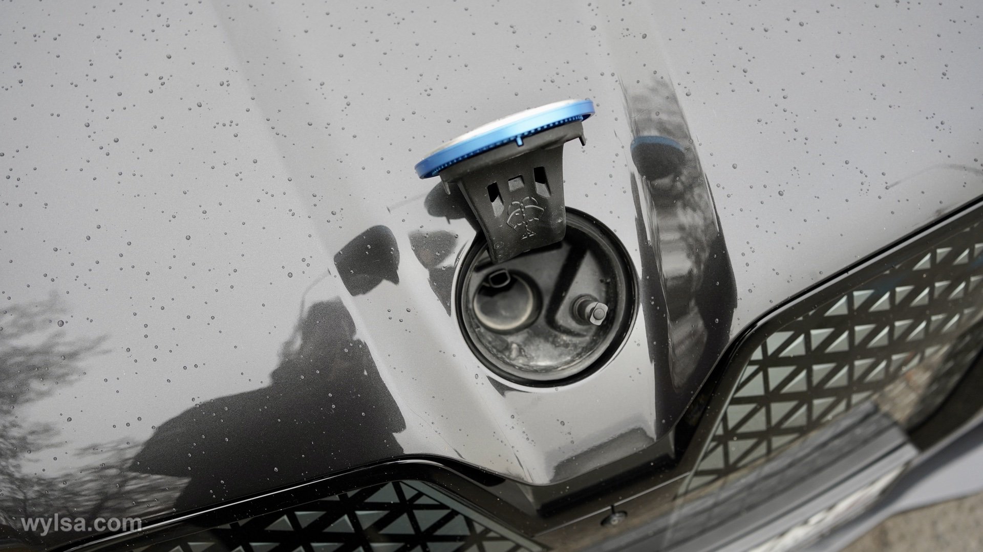 Теперь немного про экстерьер. Про омыватели камер я сказал, но тут есть ещё парочка-троечка интересных моментов. Например, здесь самый удобный лючок для омывайки, вам не надо открывать капот (его вообще не надо открывать, там нет ничего для вас интересного), просто нажимаешь на эмблему, она поднимается, туда льёшь жижу. Эта самая омывайка льётся прям из щёток, и они здесь особые, использовать нужно только оригинал. Мне, кстати, уже пора менять, и это будет стоить в районе десяти тысяч рублей.