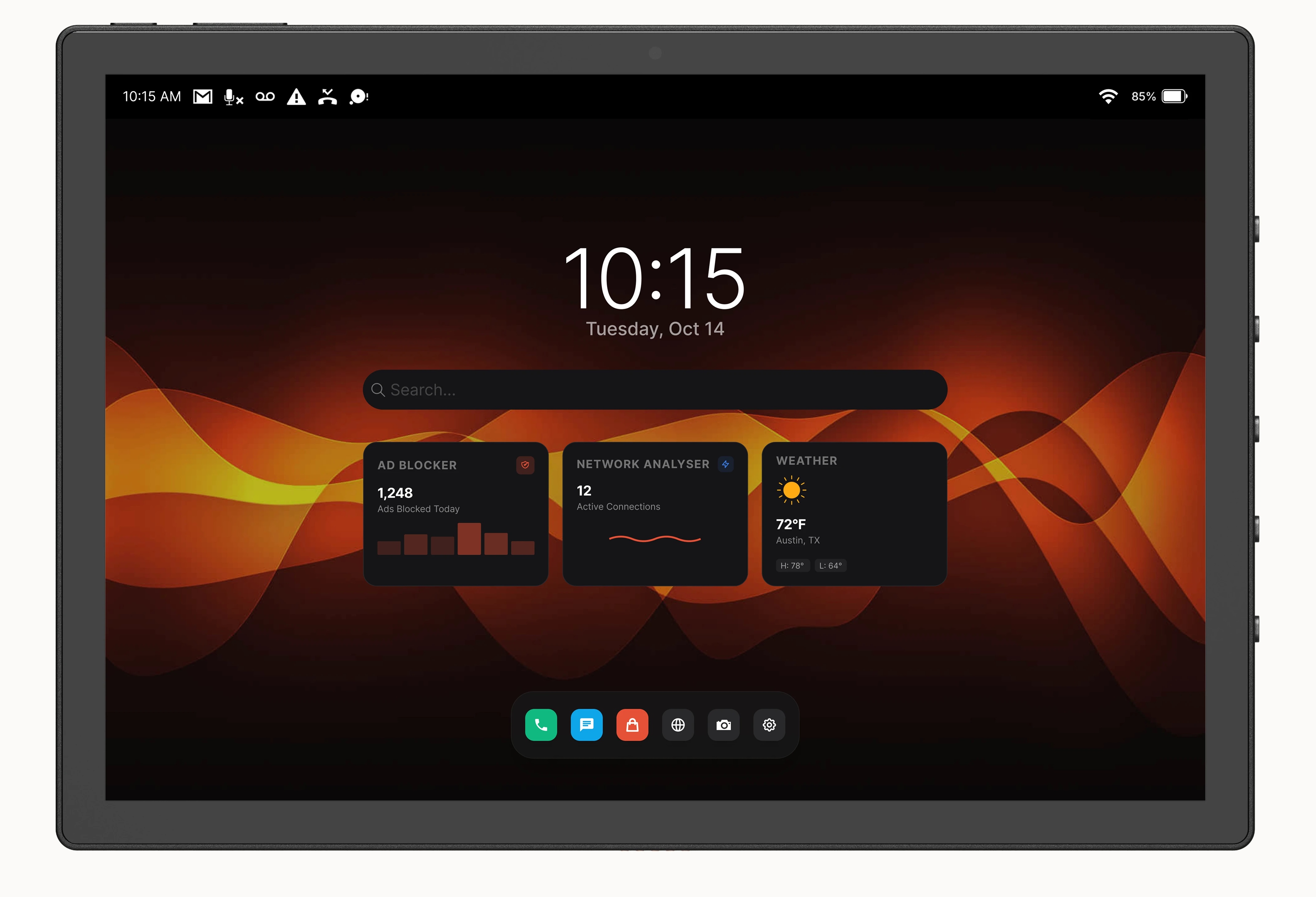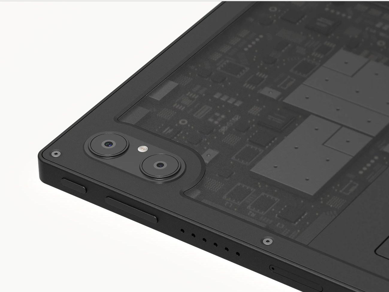 На одной грани у него 5 портов Type-C, один из которых поддерживает DisplayPort, к этому добавьте ещё microHDMI и дырку под наушники. На другой стороне — кнопки для отключения питания (!) камеры, микрофона, GPS, Bluetooth и Wi-Fi. И выглядит не так, как 99 % планшетов на рынке. Чем не хакерская кибердека?
