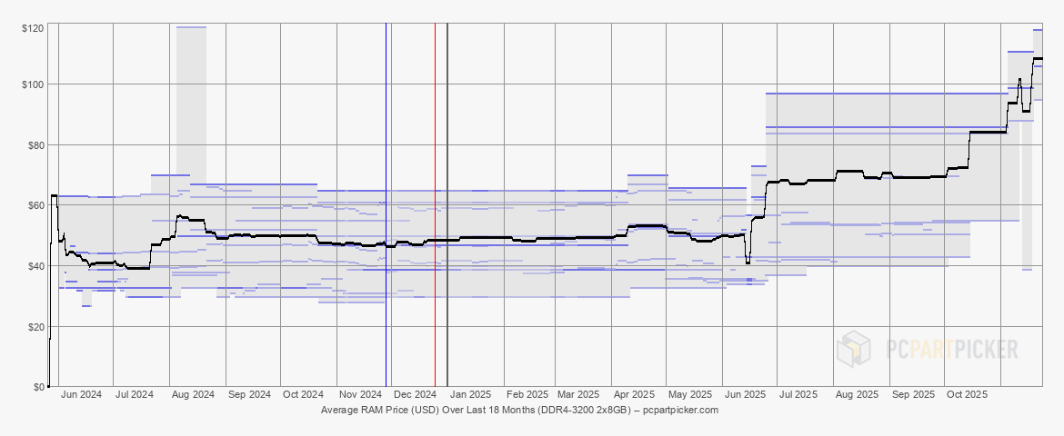 Он показывает, как менялась цена за последние полтора года на пару плашек оперативы типа DDR4 с частотой 3200 МГц по 8 ГБ каждая. И за это время она выросла примерно в 2,5 раза. Особенно сильно заметен рост в ноябре, который просто скакнул примерно с $40−50 почти до $110.