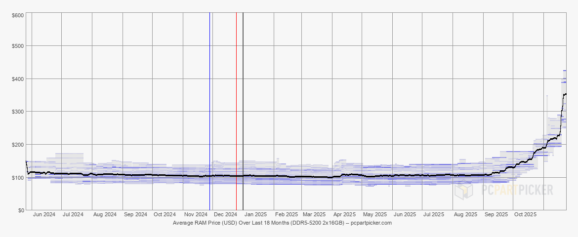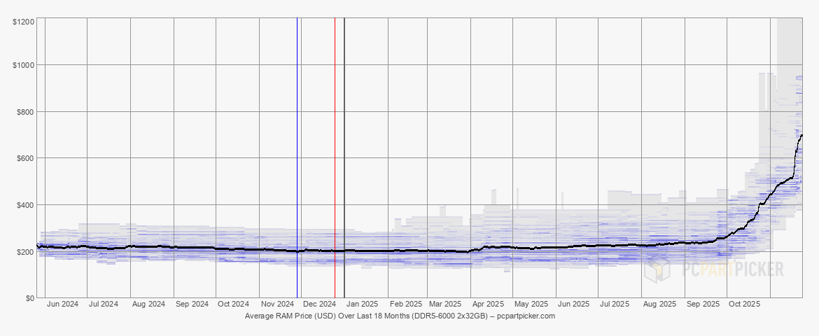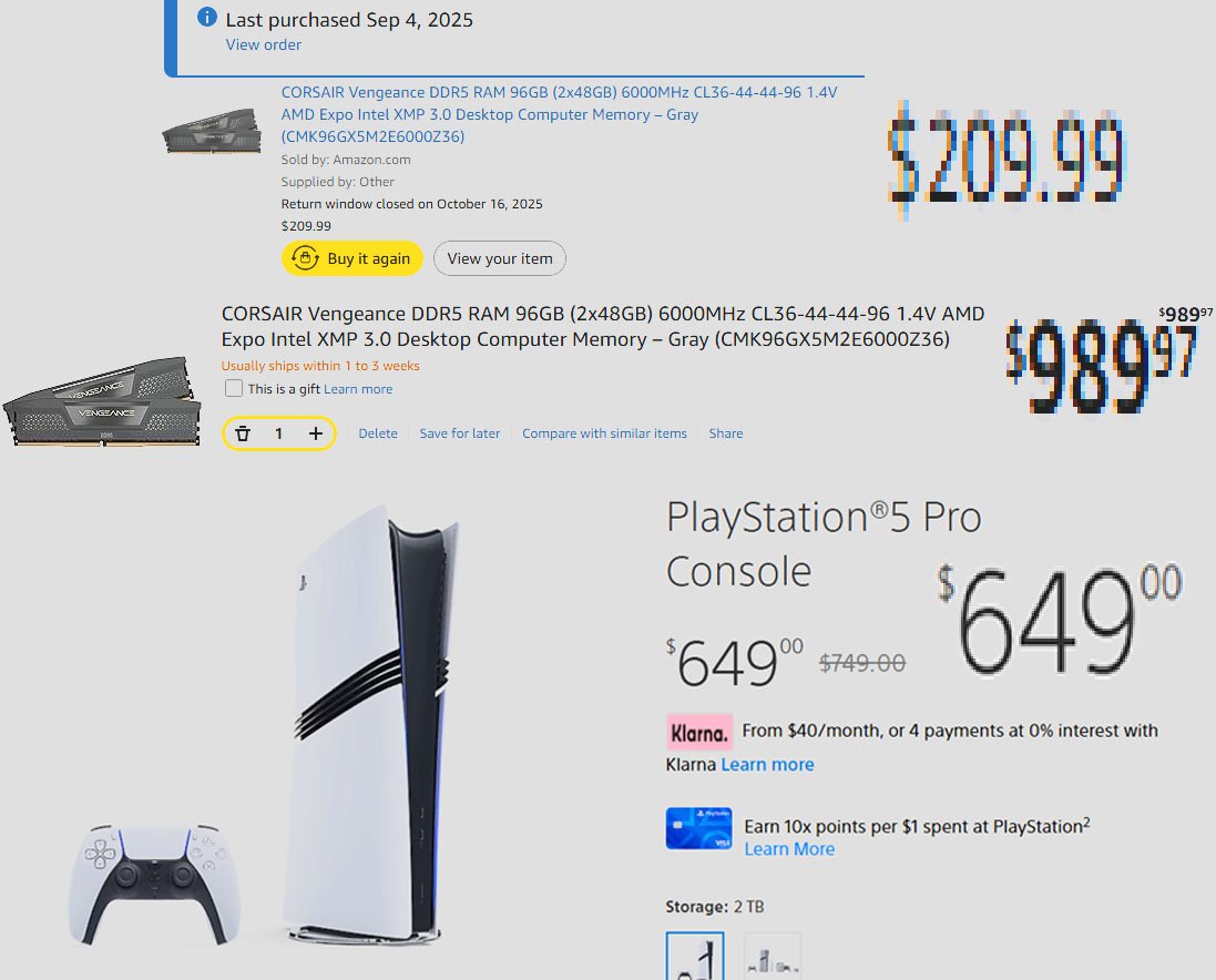 Купленная в начале сентября пара плашек по 48 ГБ (DDR5, 6000 МГц) обошлась в $210 до налогов, а уже сейчас она недоступна и стоит почти тысячу баксов до вычета налогов. При этом самостоятельные консоли стоят дешевле. Значительно дешевле.