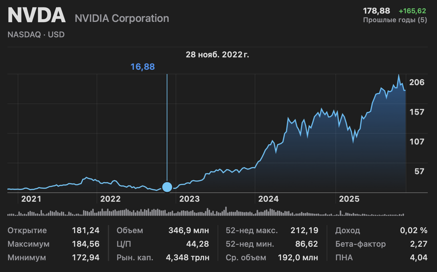 Виноват пузырь ИИ, надувшийся за три года до той степени, что из несуществующей индустрия стала самой инвестируемой в мире. На одних только ИИ-дрожжах NVIDIA превратилась в самую дорогую компанию в мире, стоимость акций которой за это время выросла с $16,5 до $179 на сегодняшний момент (со значением в $210,96 в пике 3 ноября):