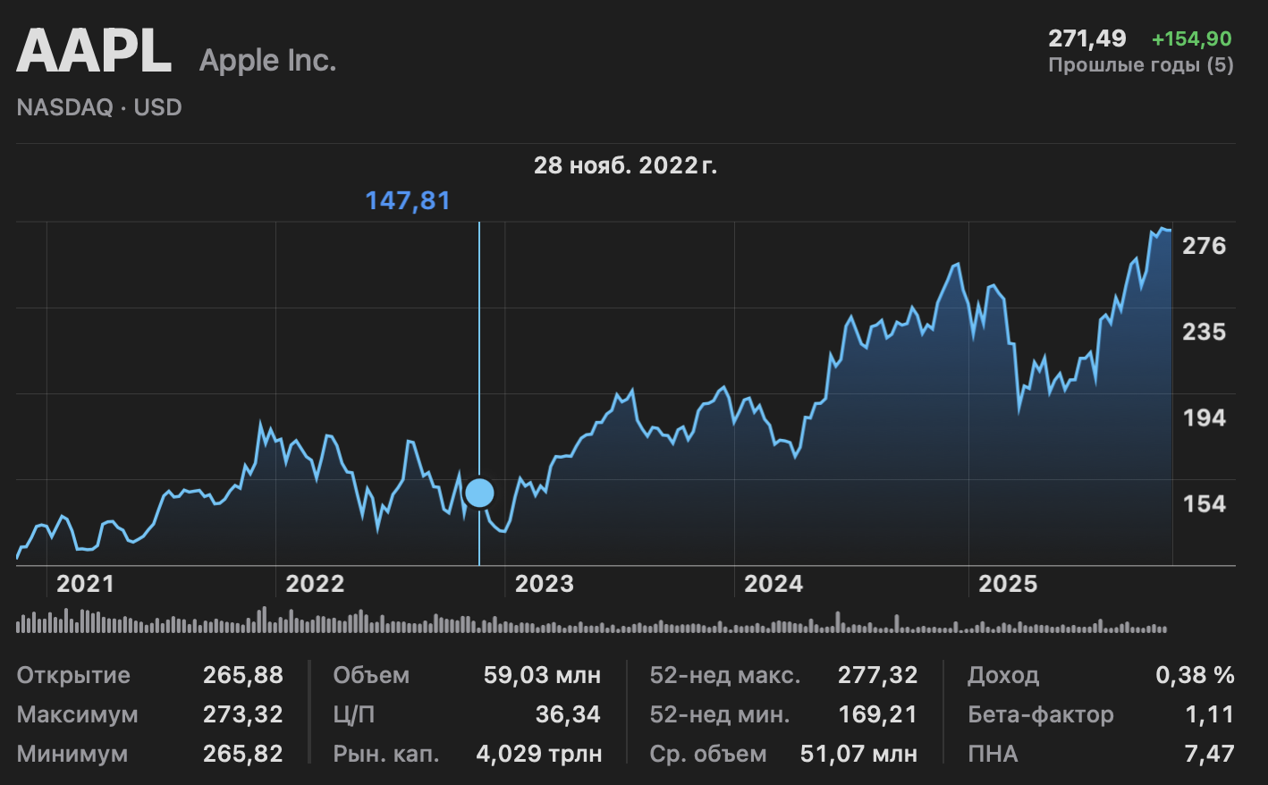 Для примера возьмём Apple, которая несильно зависима от нейробума, а рост её акций обусловлен выпускаемыми устройствами и выбранной стратегией, нежели влезанием в модную индустрию: