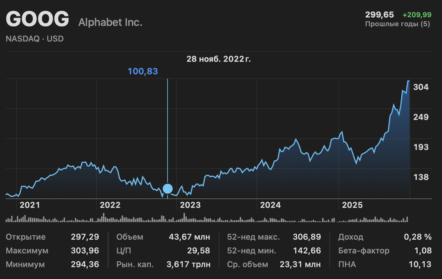 Alphabet (которой принадлежит Google) выросла без копеек в три раза, а Microsoft — в два с резким падением в конце октября с $542 до $528 за акцию.