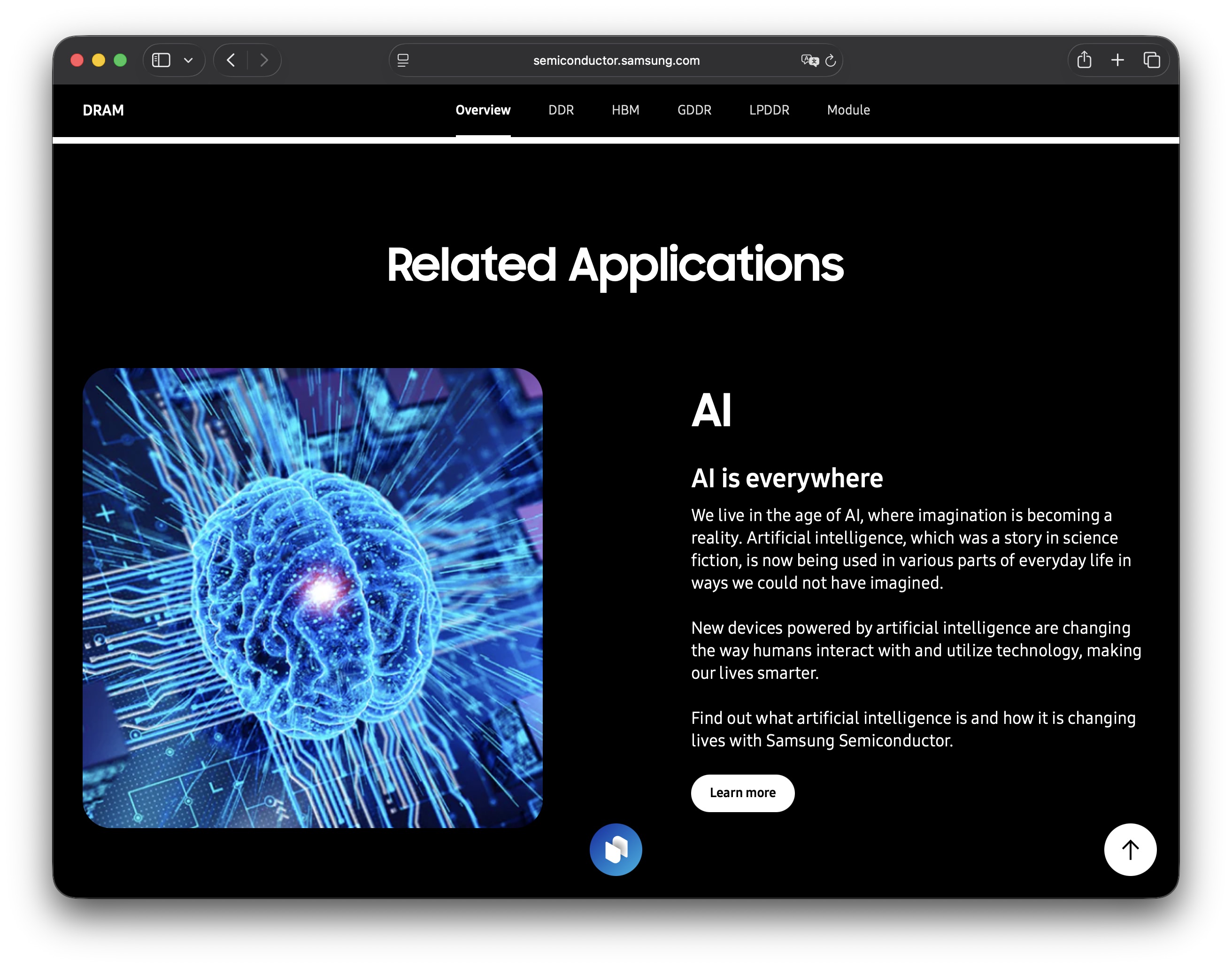 Проблема в покупателях. И тут речь не о нас с вами, а о тех компаниях, которые закупают память и трёх мастодонтов — Samsung, SK hynix и Micron. Заходим вот на сайт Samsung Semiconductor — «дочки» большого концерна Samsung — и сразу после списка типов памяти мы видим две прекрасные буквы: AI. Ну потому что он везде.