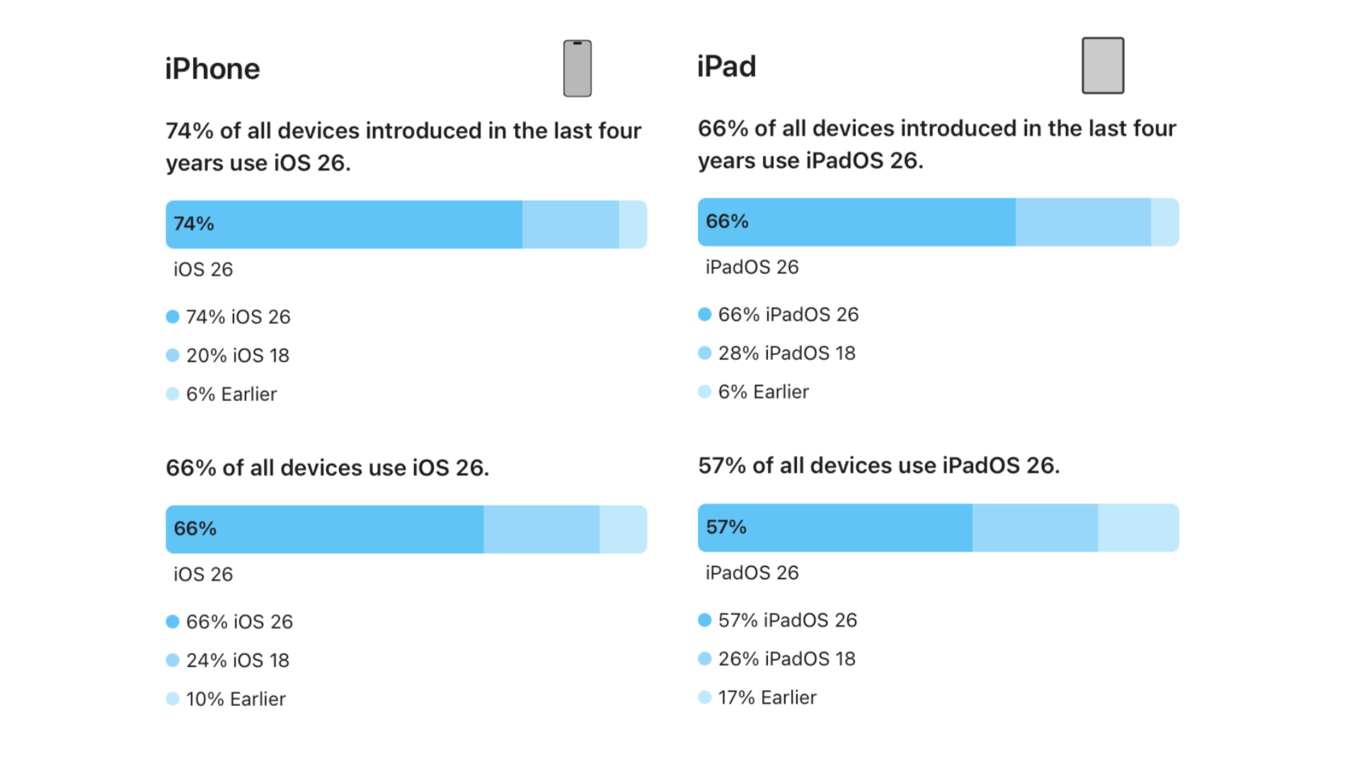 По данным Apple, 74 % пользователей современных айфонов перешли на актуальную версию iOS. А с учётом всех активных айфонов, включая винтажные, «Жидкое стекло» увидели аж 66 % юзеров.