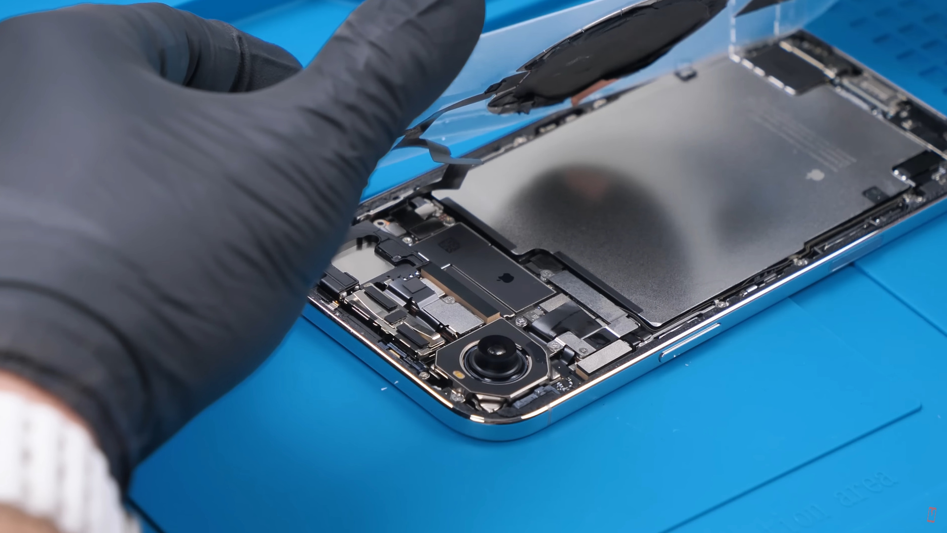 В теории для этого надо было просто снять краску с тыльной крышки, но, чтобы добраться до неё, ему сначала потребовалось аккуратно снять MagSafe-катушку и удалить металлическую рамку внутри плато с камерой, на которой были закреплены вспышка и защитное стекло камеры.