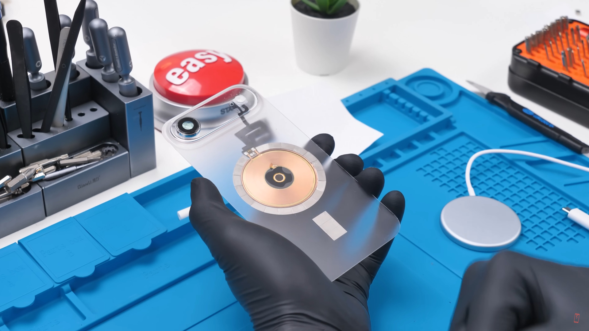 Точное расположение магнитов катушки он сохранил, зафиксировав их на внешнем MagSafe-зарядника, а вот вспышку и колпачок камеры пришлось посадить на клей к стеклянной крышке.