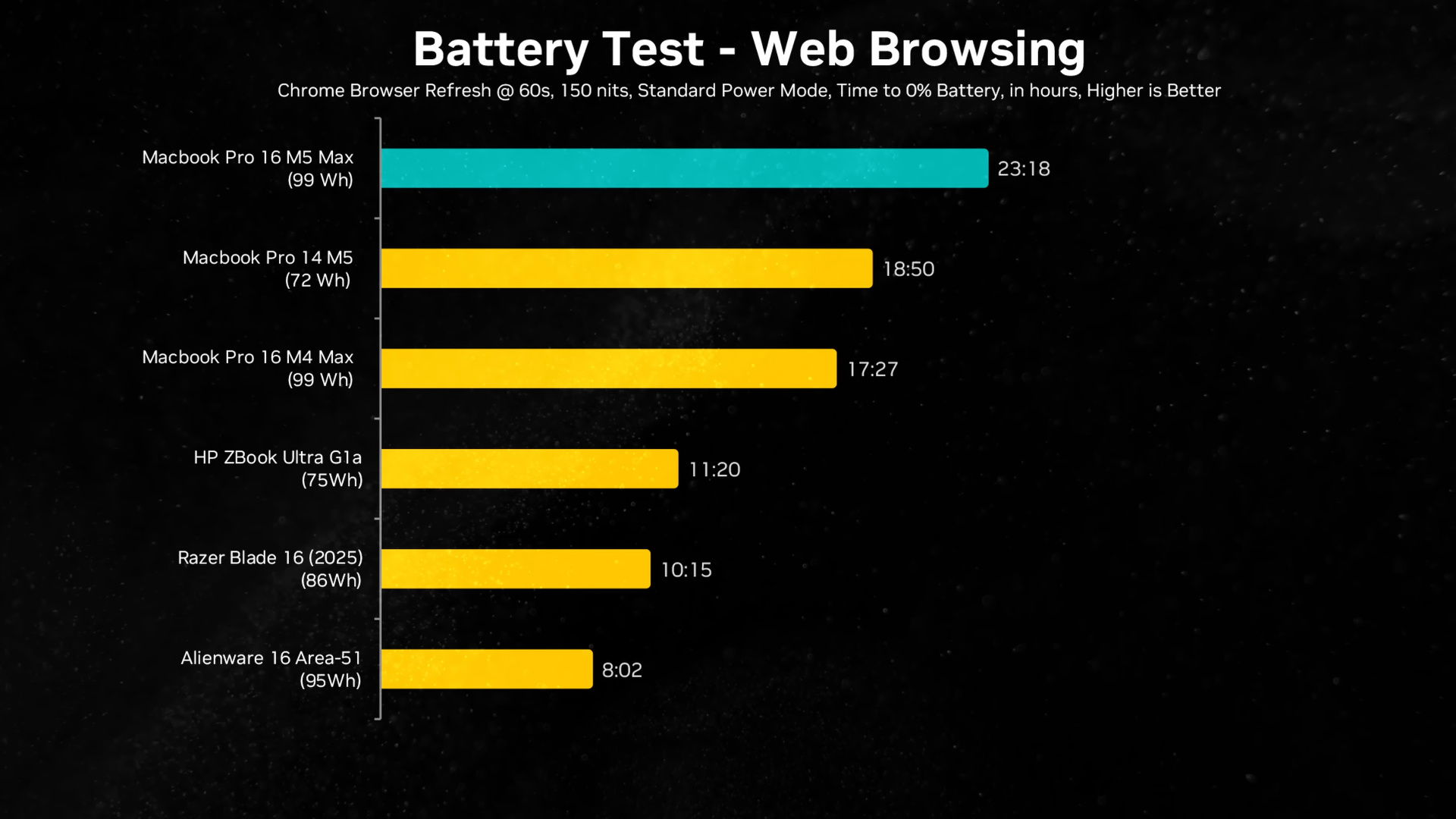Общее энергопотребление M5 Max с открытым браузером Chrome и текстовым редактором не превышает 2 Вт, благодаря чему 16-дюймовый MacBook Pro держит больше 23 часов в простых офисных задачах — на 6 часов больше предшественника на M4 Max.