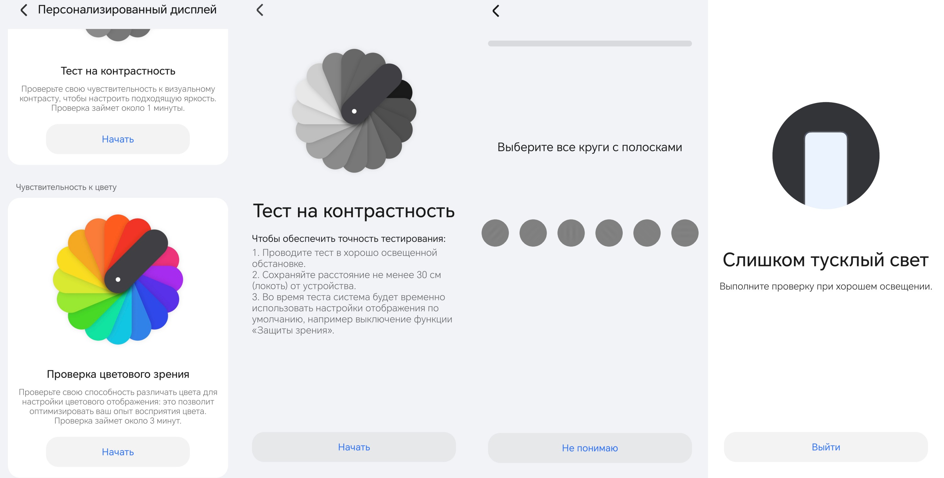 Вообще, у смартфона есть целый раздел «Экран Honor Eye Comfort», где предлагают всякие штуки для сохранения зрения. Например, вы можете пройти тесты на чувствительность к визуальному контрасту и способность различать цветовое отображения. Это в теории, потому что смартфон запускал тест и тут же писал, что ему недостаточно света, хотя позади меня огромное окно, на улице светло, всё отчётливо видно.