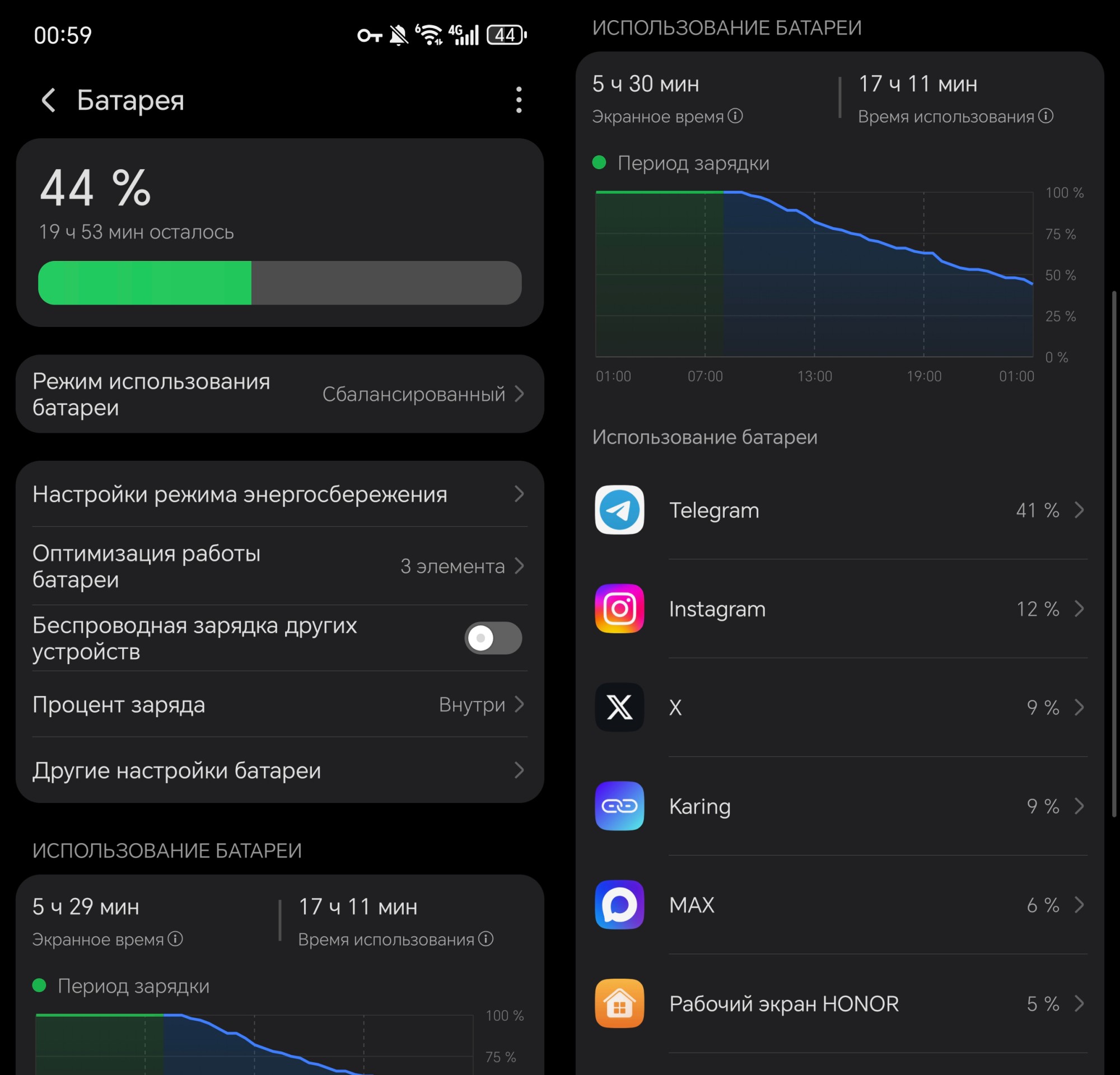 Но что мы имеем на самом деле? А на деле всё очень хорошо. Я использовал Magic8 Pro Air без каких-либо ограничений, не выдумывая никаких дополнительных сценариев и не пытаясь где-то экономить расход. Просто брал его в руки, снимая с зарядки в 7:30−7:50 и ставя где-то в районе полуночи. За день использования его как основного смартфона набегало порядка 5,5 часов экрана. Остаток — в районе 40 %.