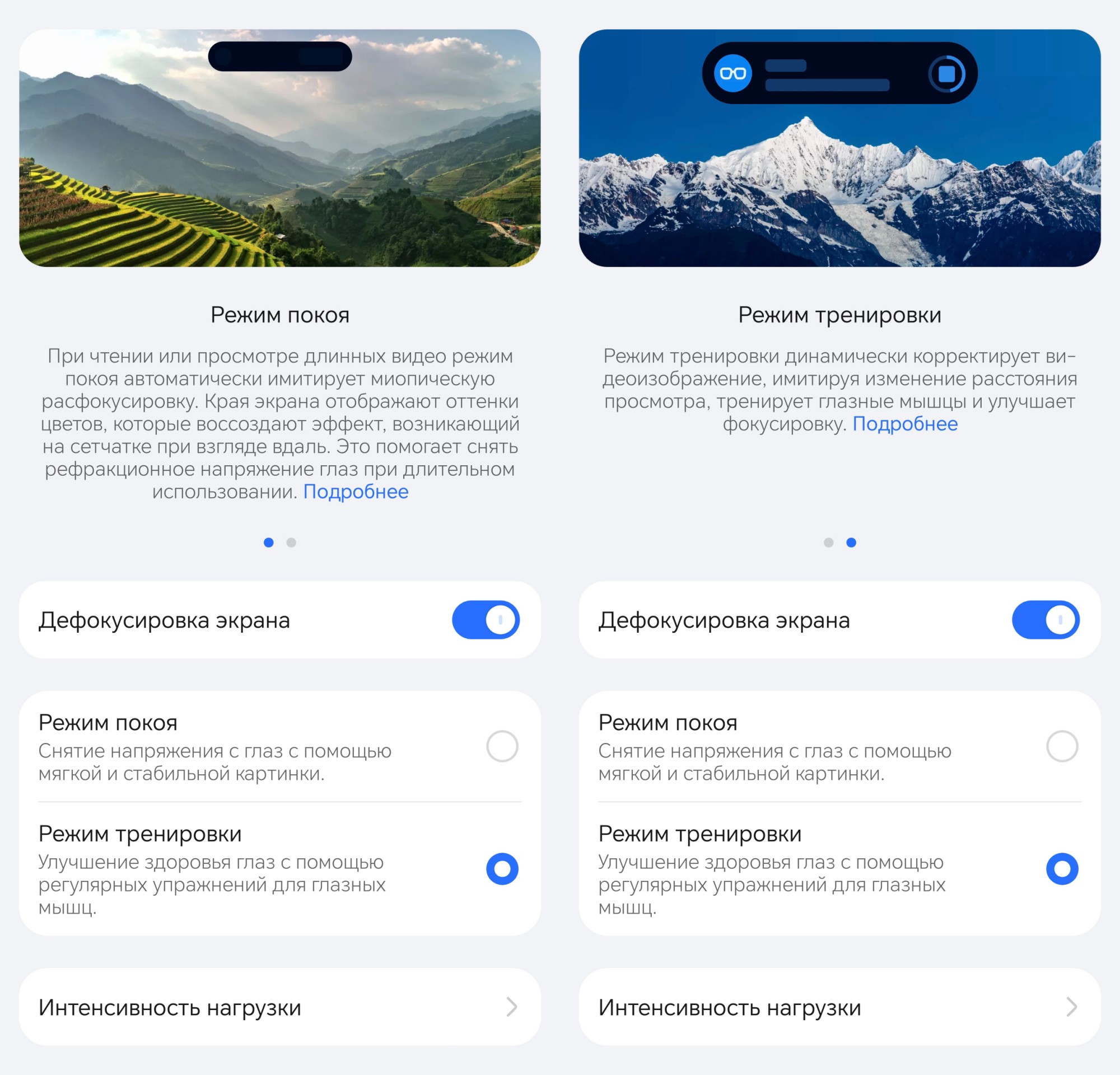Ещё интересный раздел, называемый «Дефокусировкой экрана», который имитирует взгляд вдаль для снятия напряжения. Он работает при чтении или просмотре длинных видео.