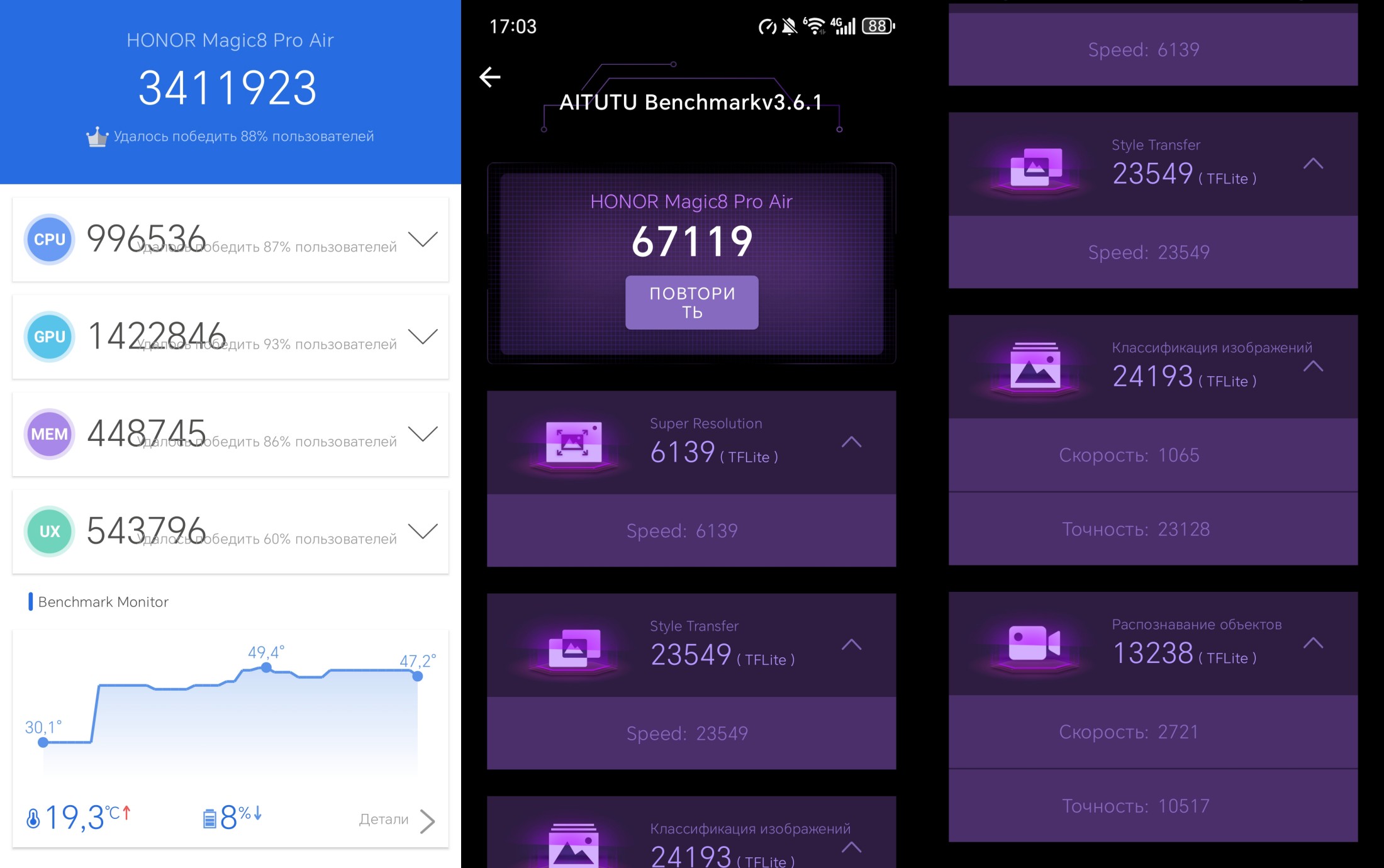 - AnTuTu, наоборот, убивался телефоном из-за слишком высокой температуры в сбалансированном режиме, но в производительном — пожалуйста, вот твои три с лишним миллиона «попугаев». Аналогичный результат выдал и AiTuTu;