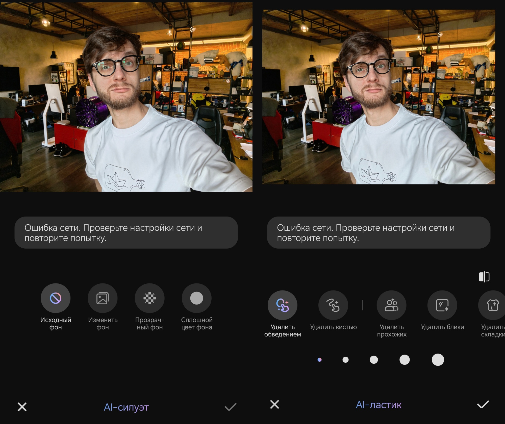 Кстати, китайские нейросети, доступные, например, в галерее, у меня завелись лишь с большими оговорками. Я не смог удалять объекты с фотографий, делать из фоток аниме — долгая загрузка завершалась ошибкой сети. Но вот блики в линзах очков удалиться смогли:
