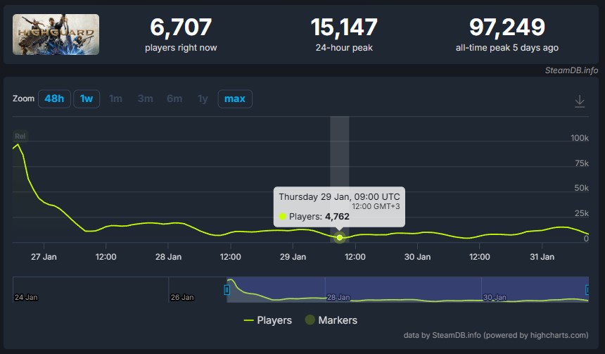 К чему это привело? На старте игра быстро добралась до 100 тысяч одновременных игроков в Steam, но так же быстро их растеряла — на момент написания этого текста онлайн Highguard болтается в районе 5-10 тысяч, что, в целом, не самый плохой результат для нового проекта, но не после такого взлёта.