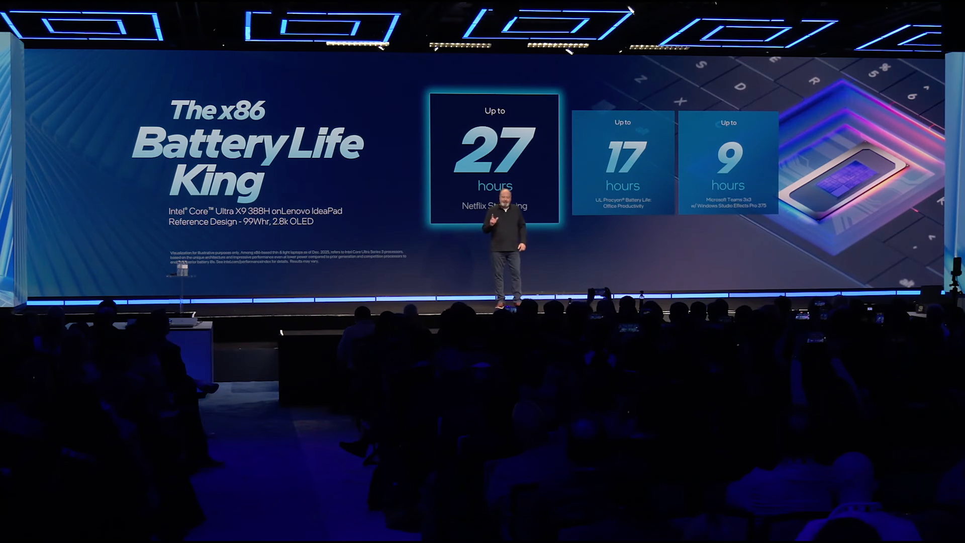 Новенький чип Core Ultra X9 388H компания называет королём автономной работы, но до уровня Apple Silicon ему ещё далеко. Аккумулятор ёмкостью 99 Вт⋅ч Ultra X9 в идеальных условиях сажает менее чем за 17 часов работы в офисных приложениях и за 9 часов видеозвонков.