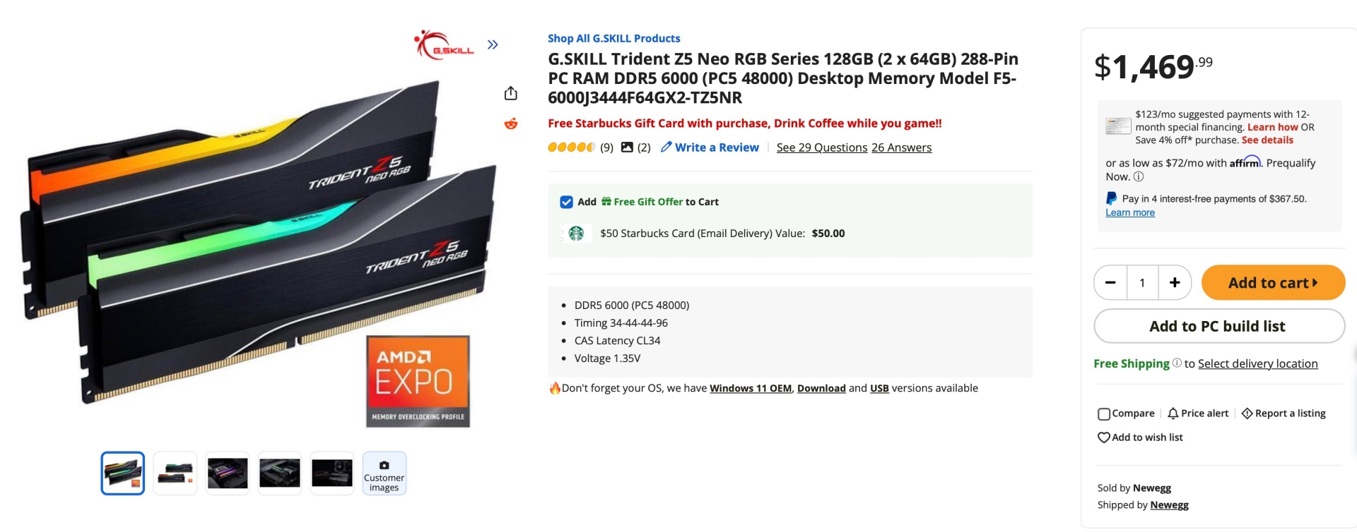 «Пейте кофе, пока играете», — говорится в описании G.Skill Trident Z5 Neo RGB на 128 ГБ в магазине Newegg. Стоимость комплекта достигает $1470, и в качестве стимулятора для покупки магазин предлагает купон на $50 в Starbucks. Ну как от такого отказаться?