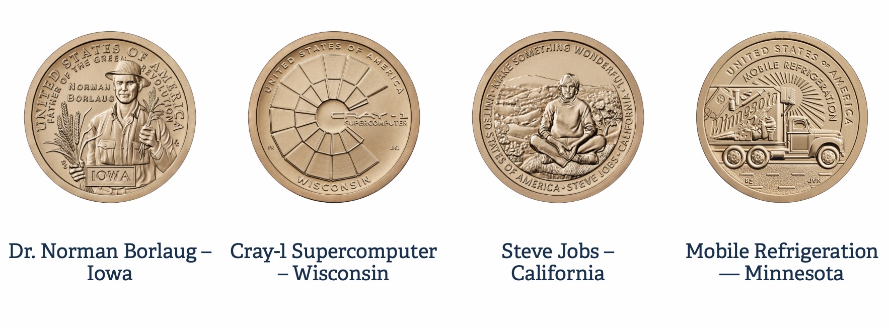 Кроме Стива, собственных монет удостоятся доктор Норман Борлауг из Айовы (известен как отец «Зелёной революции»), суперкомпьютер Cray-1 из Висконсина и мобильное холодильное оборудование из Миннесоты. Последняя монета, несмотря на простоватое описание, отражает важность мобильных холодильных аппаратов. Например, с их помощью стала возможной перевозка вакцин, которые требуют особого температурного режима.