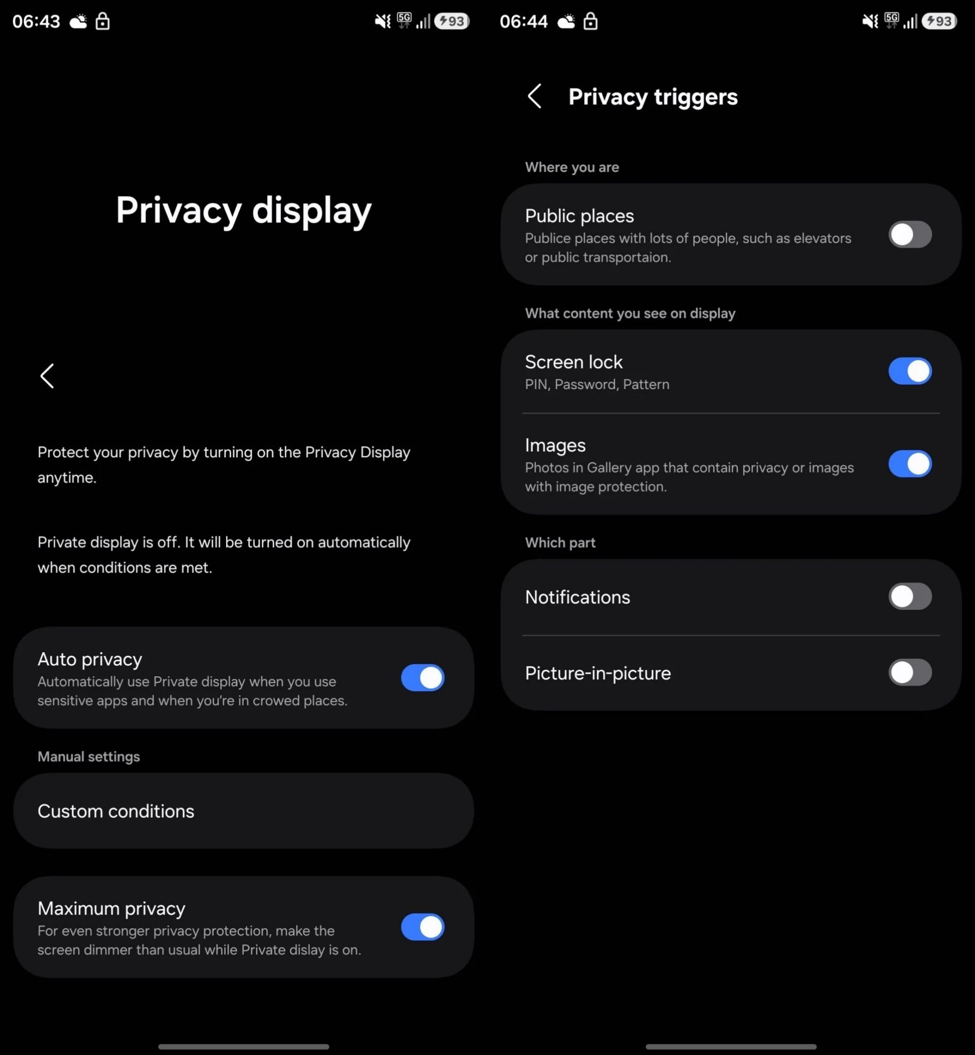 Функция называется Privacy Display, и, судя по утёкшим скриншотам, она может включаться автоматически: в людных местах, в транспорте, в лифте и так далее. Также можно регулировать интенсивность этого покрытия. Что будет весьма кстати, ведь от сторонних плёнок зачастую очень болят глаза. А тут можно будет и включать, только когда есть необходимость, и силу эффекта настраивать.