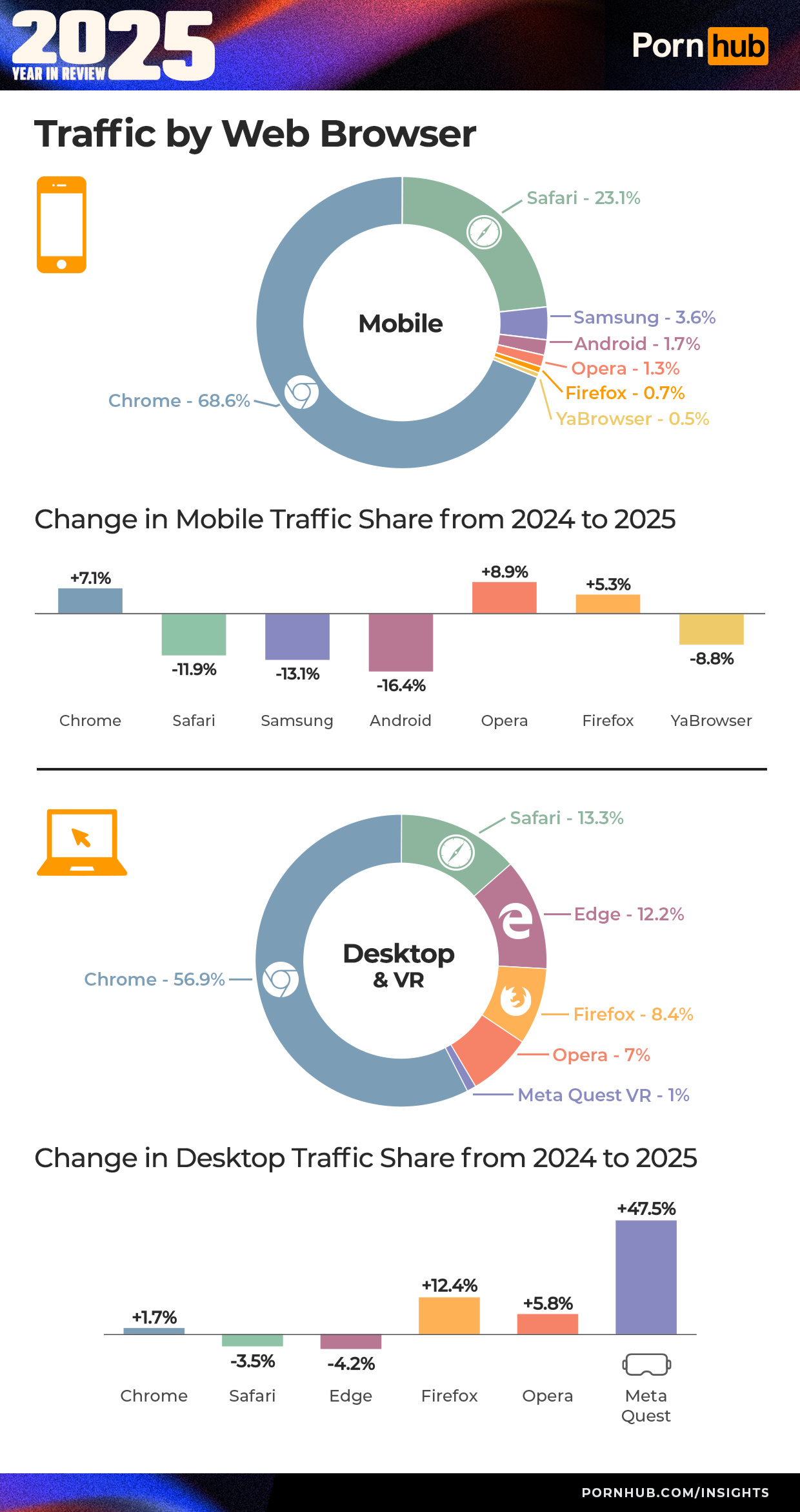 Доля браузера Safari, по сравнению с прошлым годом, сократилась с 26 до 23 %, из-за чего в мобильном сегменте и на десктопах безоговорочно лидирует Google Chrome, а на VR-гарнитуры Meta* Quest приходится 1 %.