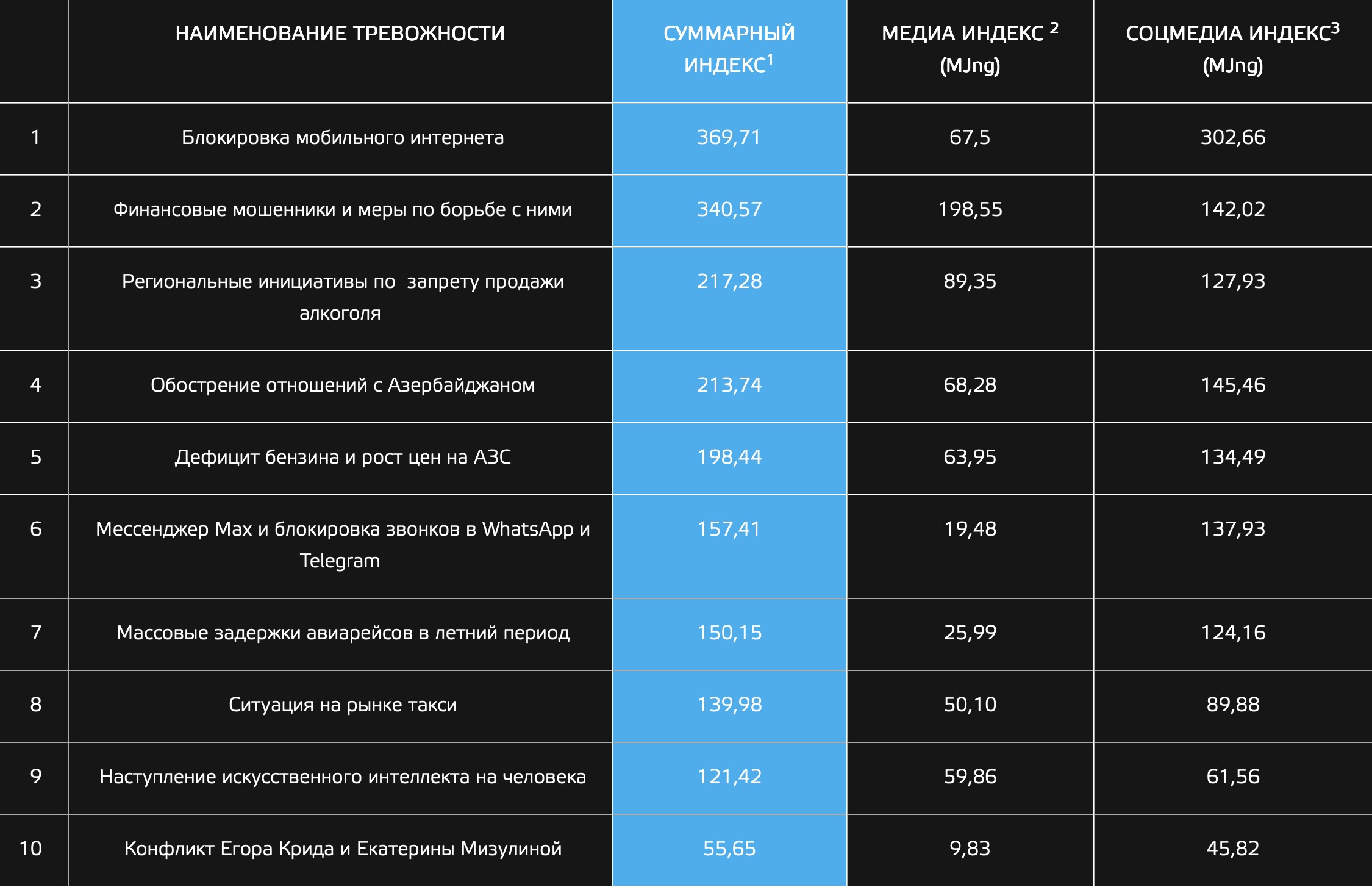 Самой животрепещущей темой для наших граждан стали блокировки мобильного интернета, исходя из «Национального индекса тревожностей» коммуникационного агентства КРОС.
