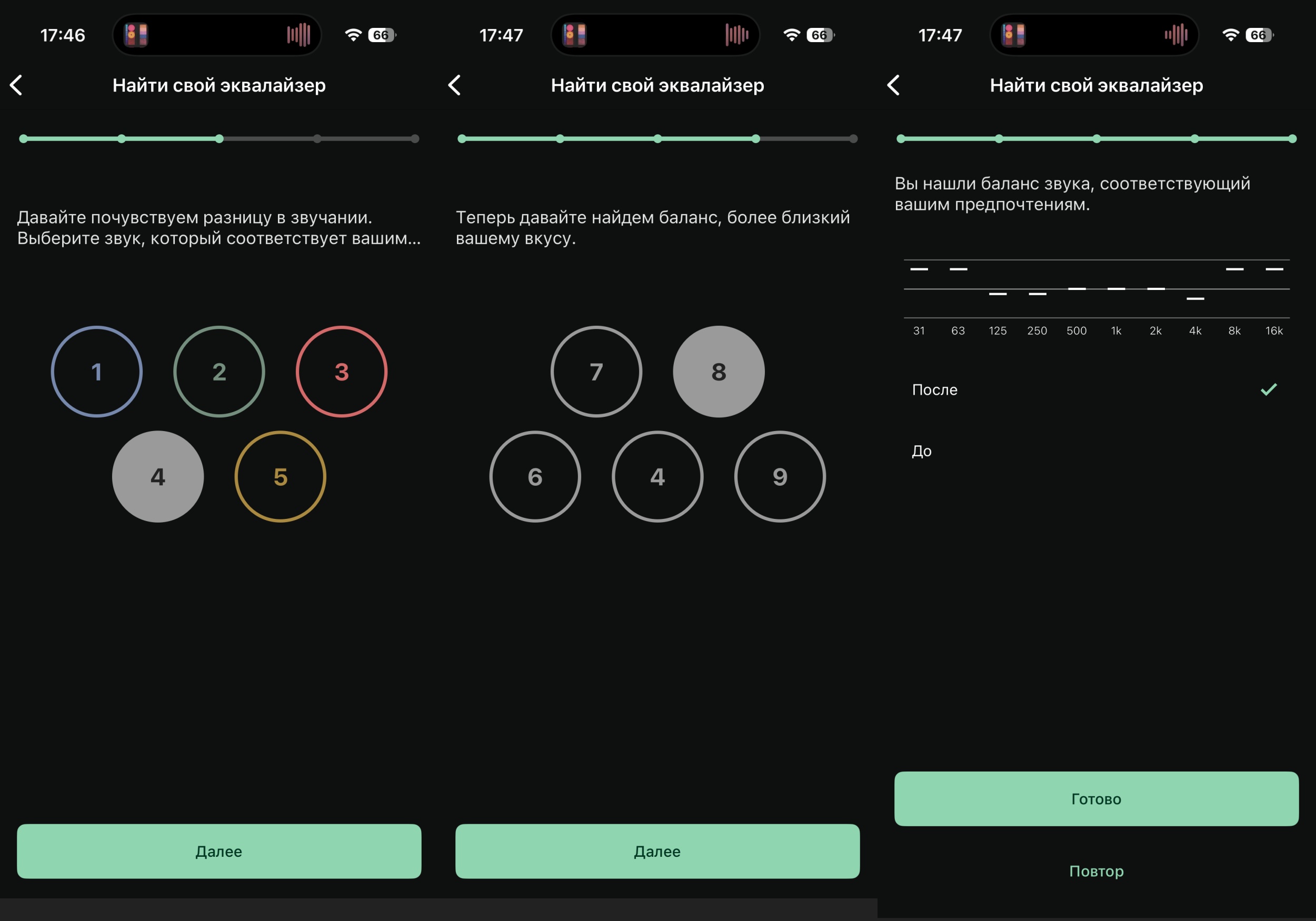 А ещё если порыться в приложении, то можно отыскать пункт в настройках наушников «Найти свой эквалайзер». И это лучший вариант персонализации наушников, что я слышал. Никакие попытки вроде «послушайте слабый писк в каждом наушнике и нажмите на кнопку, когда ничего не будете слышать», никакие фотографирования ушных чашек не приводили к тому, что сделал этот пункт.