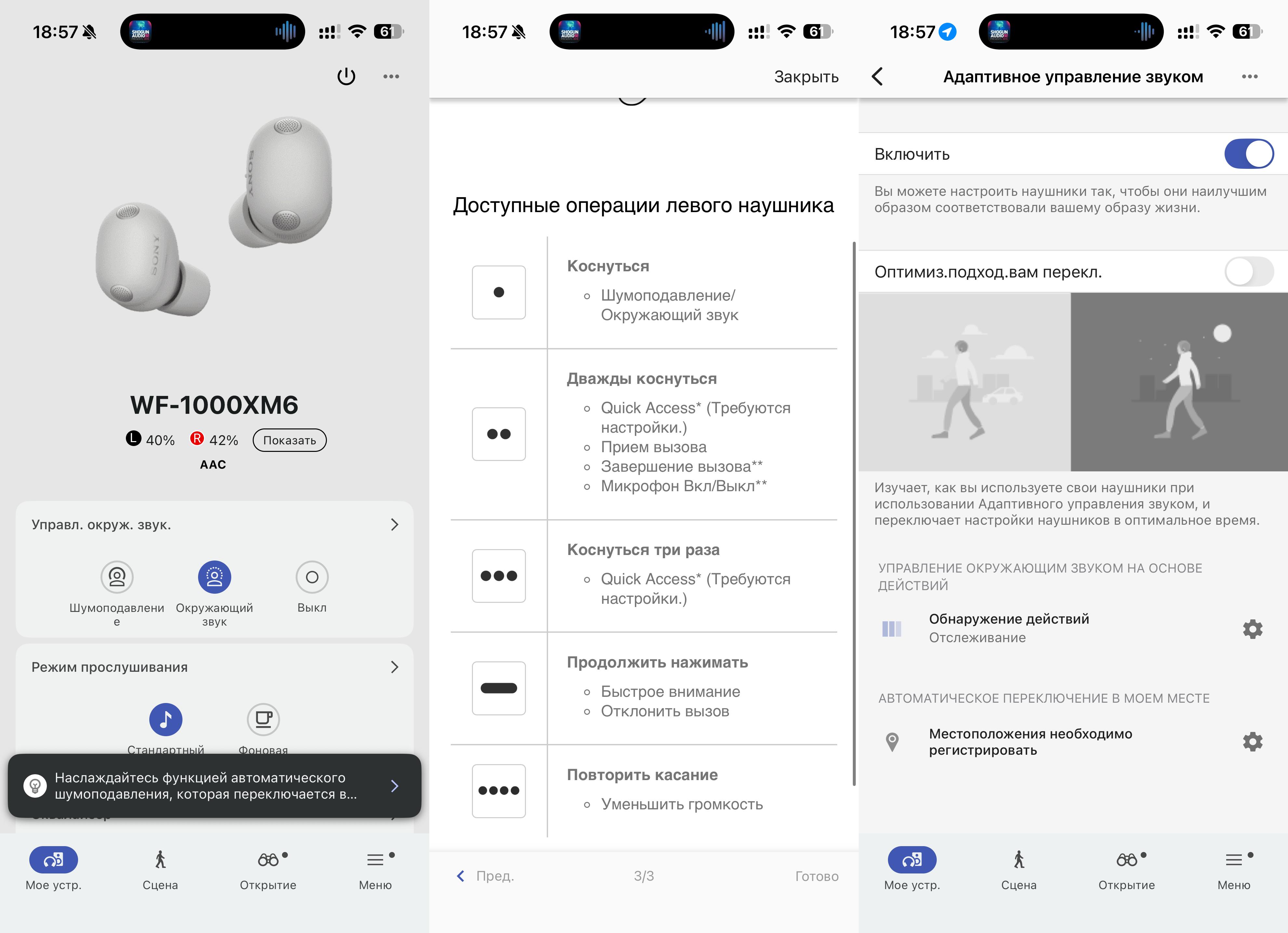 Управление реализовано неплохо, можно делать всё, что вы привыкли, регулировка громкости тоже есть. В настройках можно ловко подключить XM6 сразу к двум гаджетам, получается конструкция, схожая с переключением у AirPods.