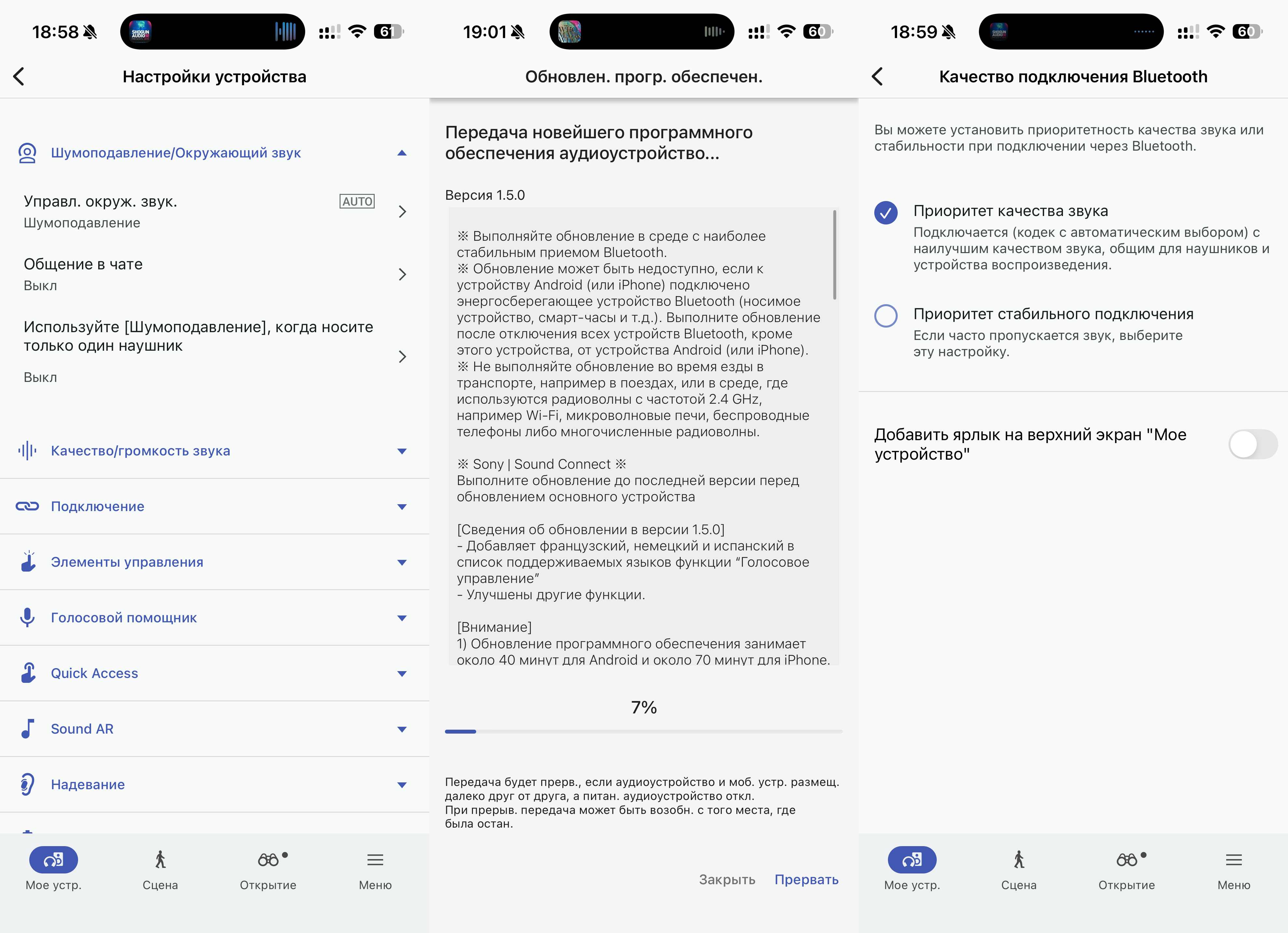 Насчёт обновления ПО имейте в виду: прошивка передаётся, пока вы носите наушники, процесс не быстрый. В целом оно всё может произойти без вашего участия, будет по кусочкам передаваться информация, потом это всё как-то соберётся, и произойдёт магия, но я лично открыл пункт меню про обновление и дождался финала.