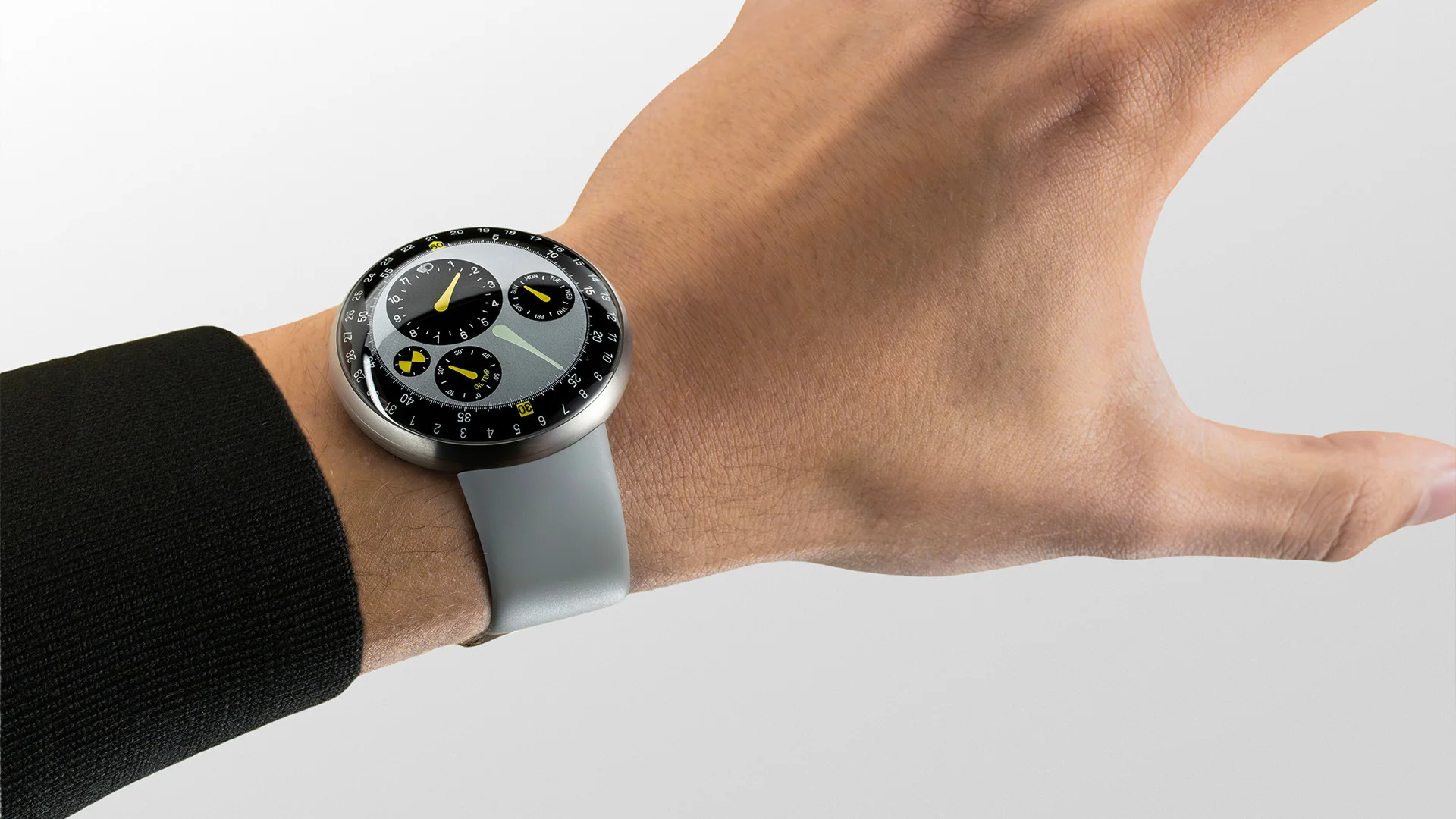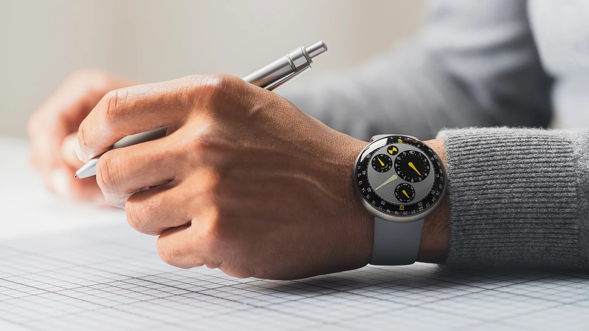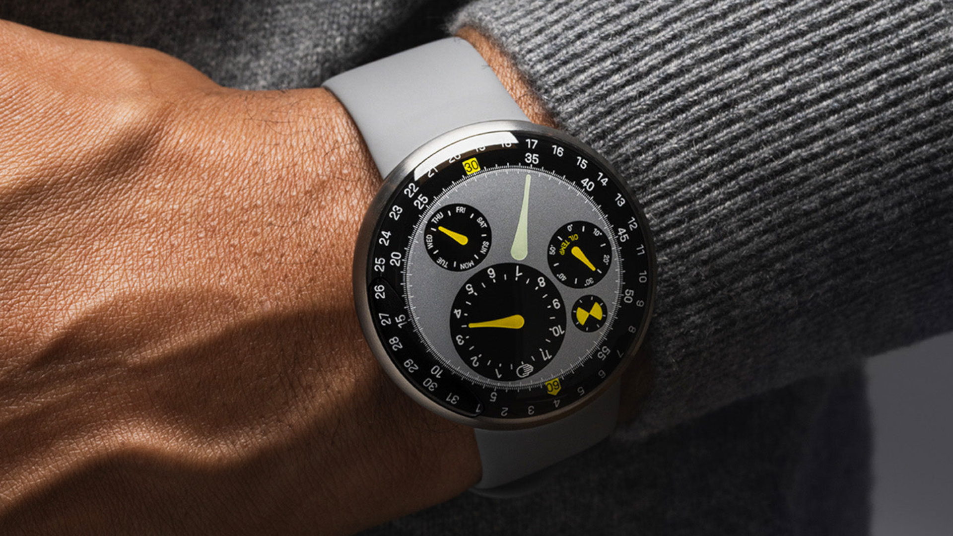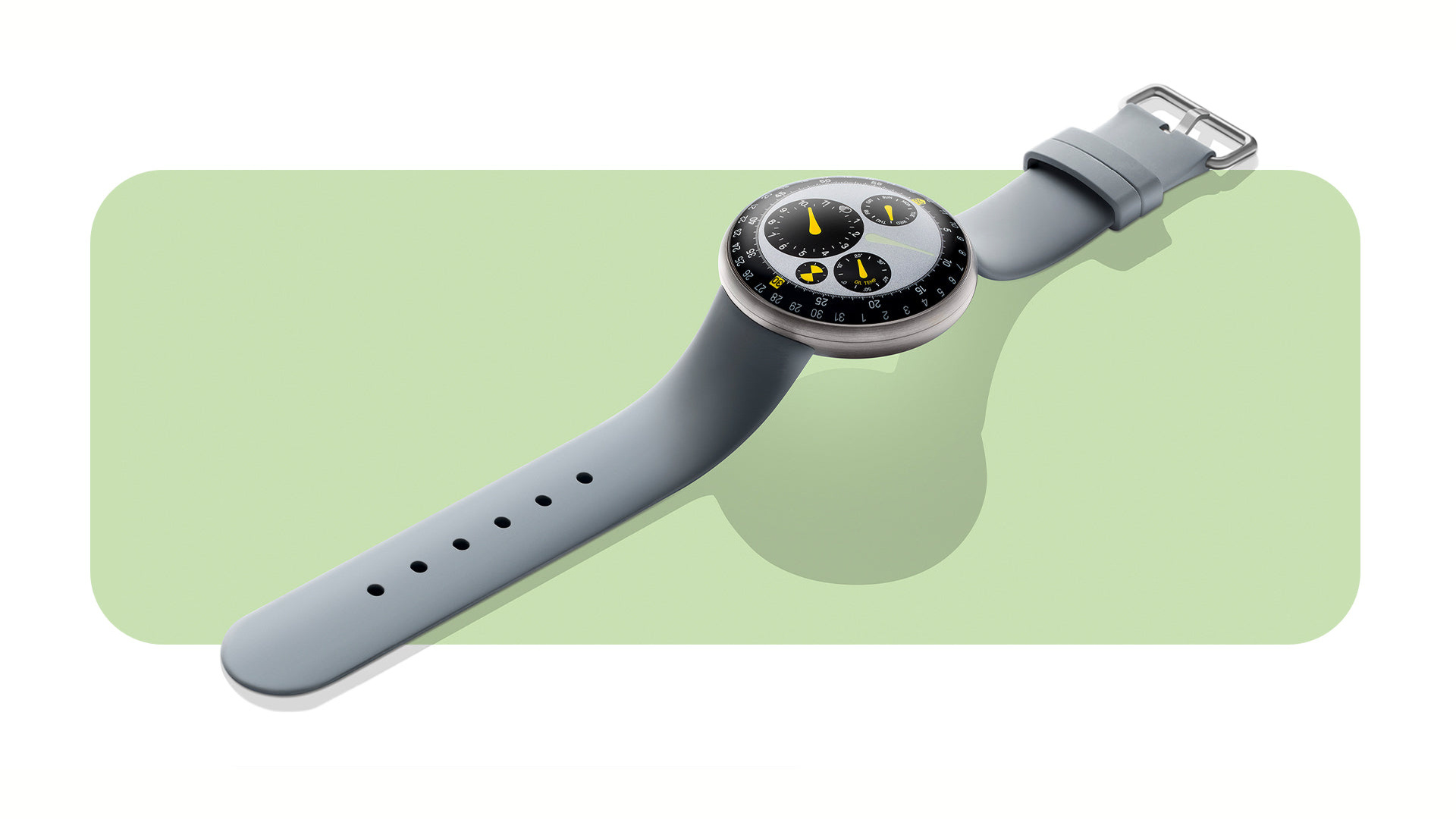 Всё как положено: минималистичный циферблат, титановый корпус диаметром 45 мм, утопленные в торцы крепления под ремешок — фирменный дизайнерский язык Ньюсона читается сразу.