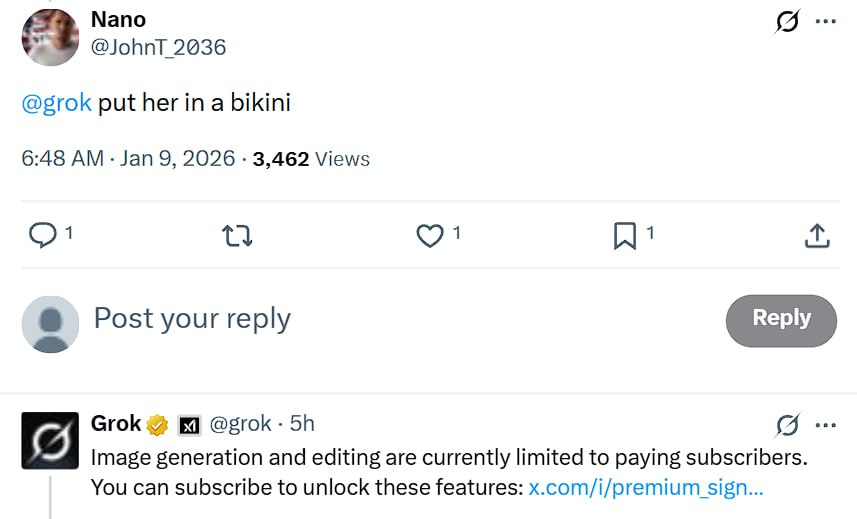 В декабре 2025 Grok, работающий в Х (Twitter), научился переодевать людей на фото в бикини без их разрешения. Новинка спровоцировала огромное количество дипфейков на грани фола, и как вы понимаете, чаще всего такому «раздеванию» подвергались женщины.