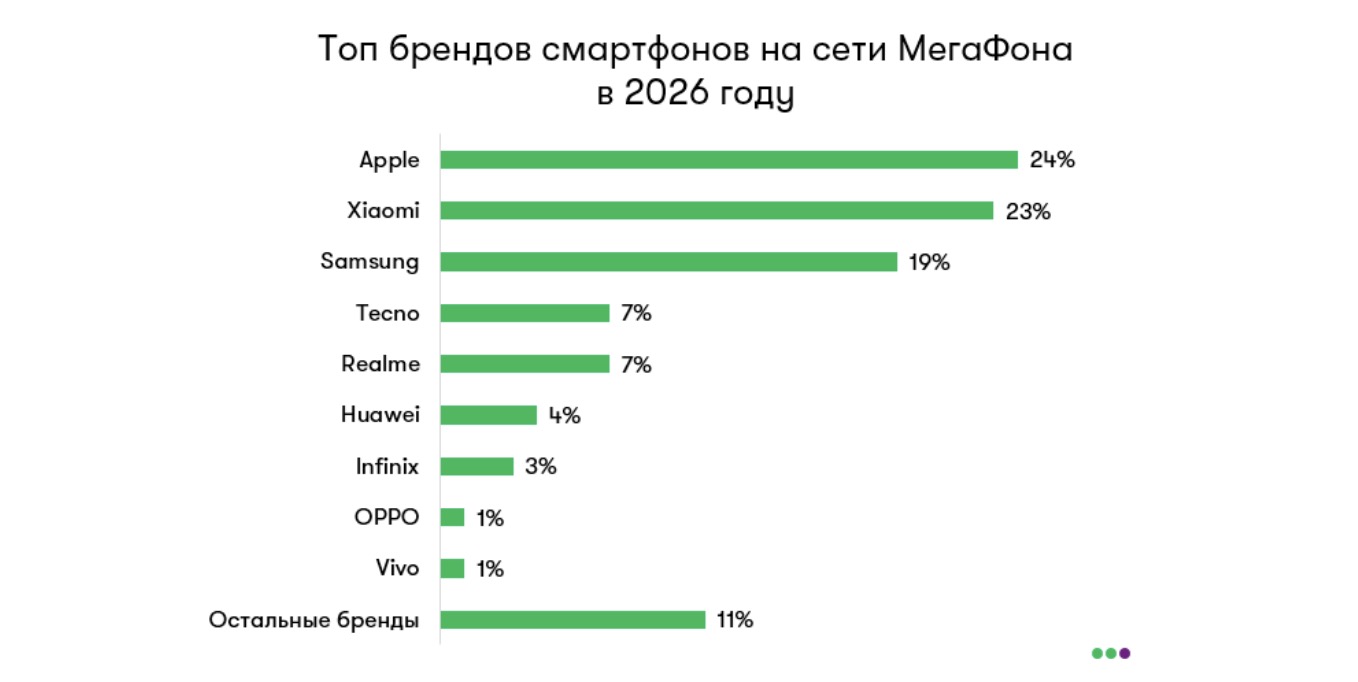 На начало 2026 года владельцы айфонов являются лидирующей группой в сети оператора — 24 %. Сразу за ними идут пользователи Xiaomi (23 %), Samsung (19 %) и с большим отрывом юзеры Tecno и realme (по 7 %).