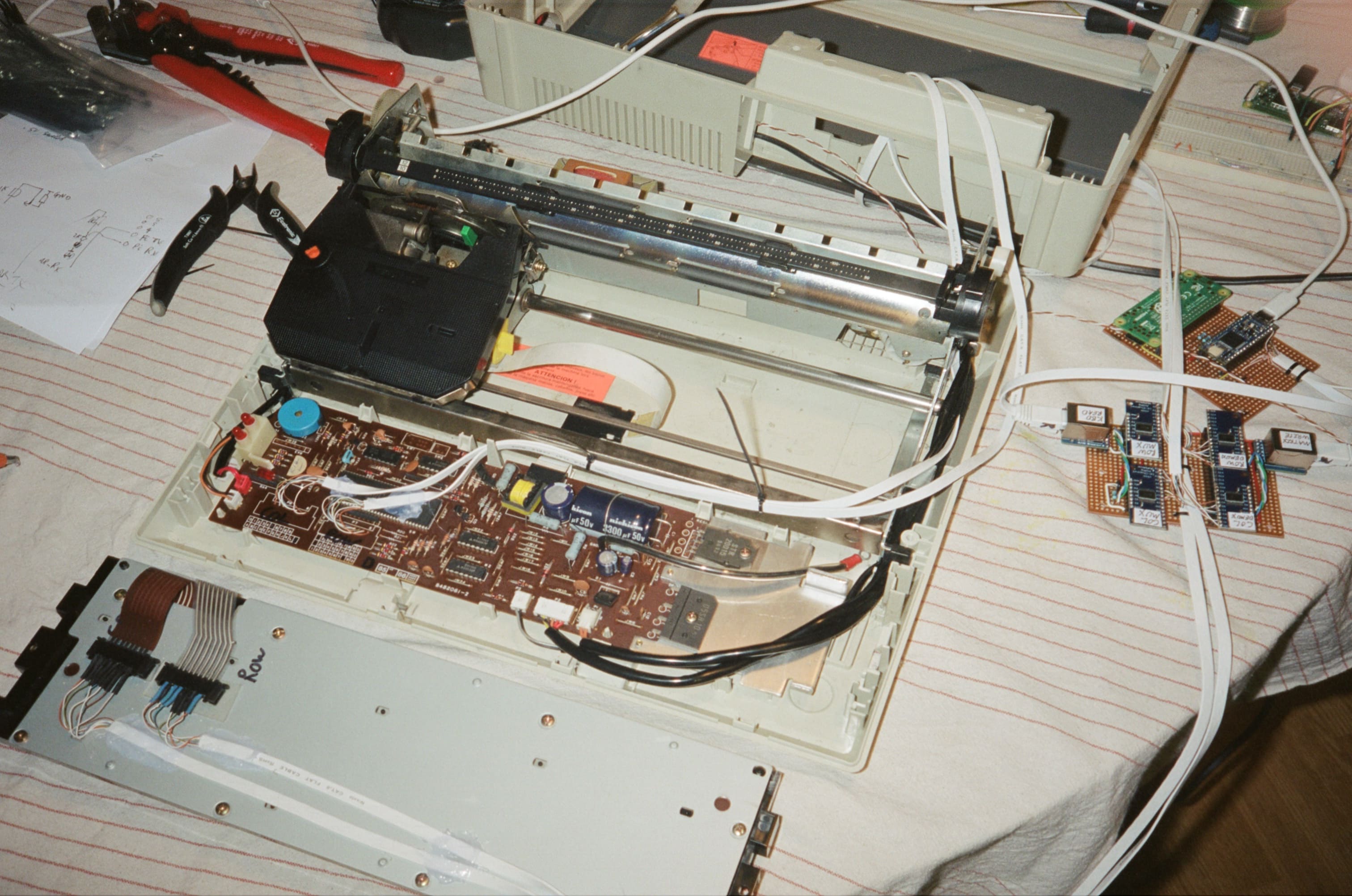 Так что машинка сама ни на что не отвечает, а выступает физическим интерфейсом для связи с облачной моделью. Передача импульсов на контакты клавиш имитирует нажатие на кнопки, и получается, что аппарат будто сам печатает, отвечая на вопросы. Машинка стучит, листы покрываются буквами и ложатся в стопки — красота.