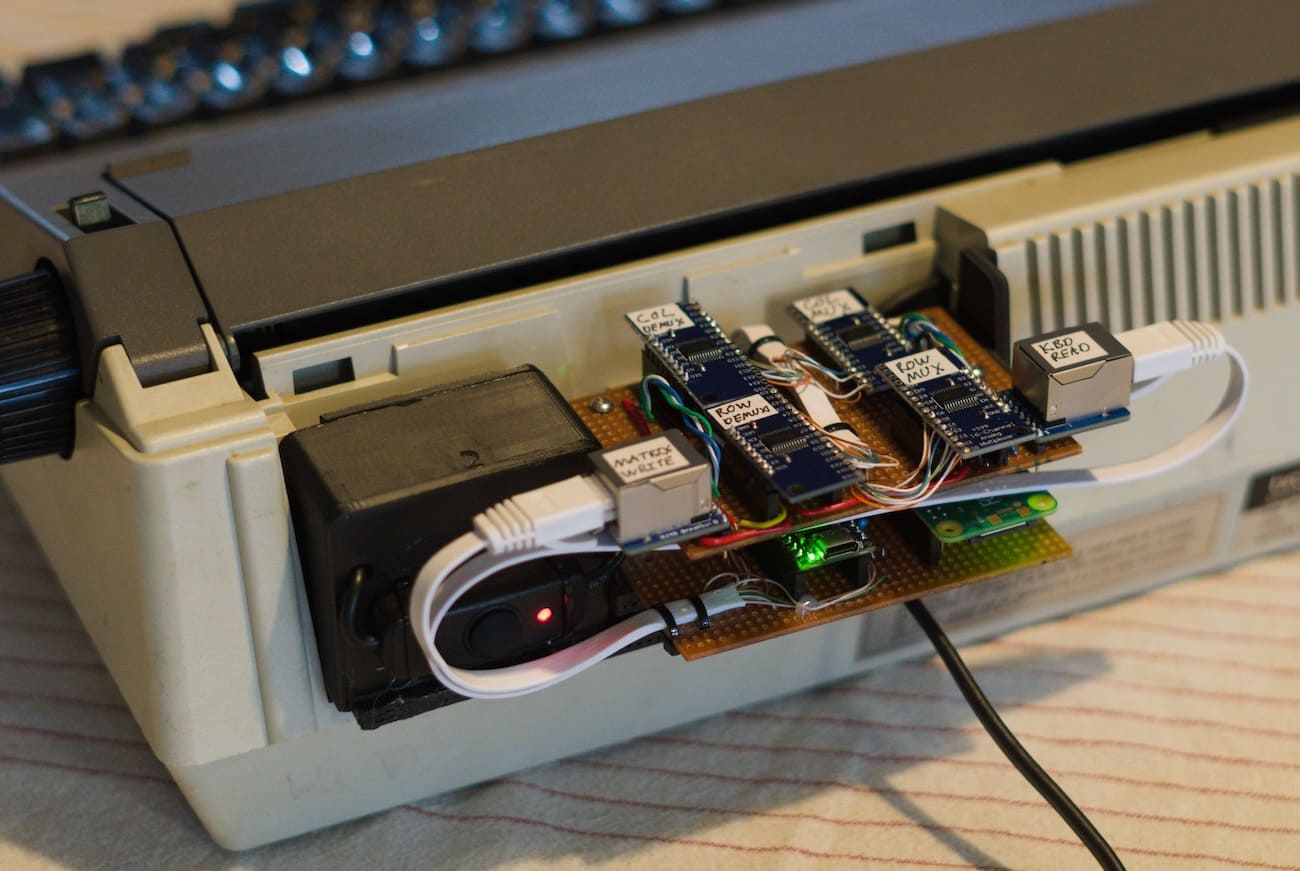 Автор из Лондона собрал аппарат ради эксперимента, и работа вышла кропотливая. Внутри корпуса он подключил 32 контакта для перехвата нажатий клавиш, а снаружи — остальную электронику, в том числе одноплатный компьютер Raspberry Pi Zero и полноценный Linux-терминал для обработки и передачи сигналов. Всё это дело по API связано с нейросетью Claude, благодаря чему та и отвечает на вопросы.