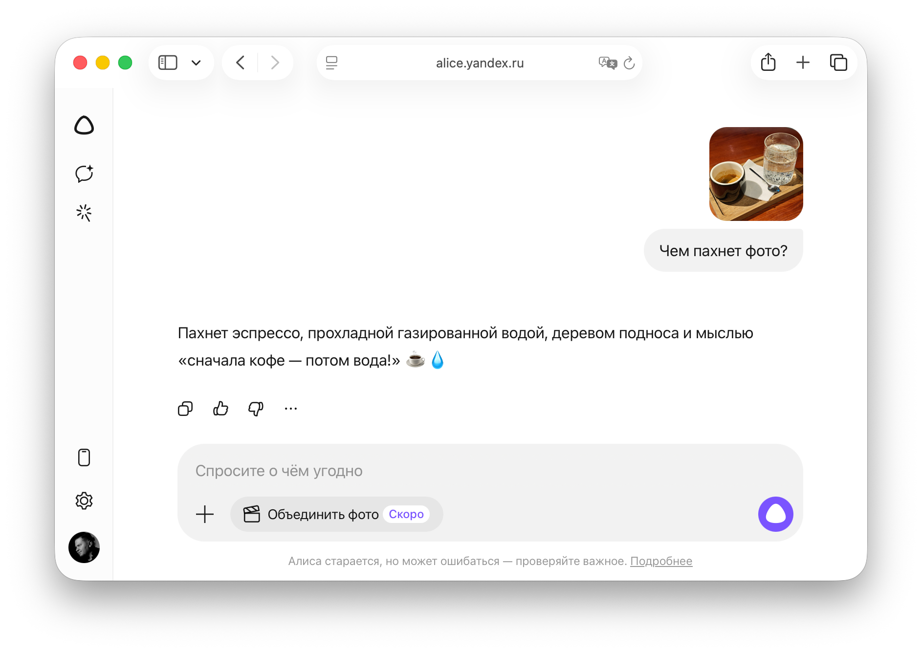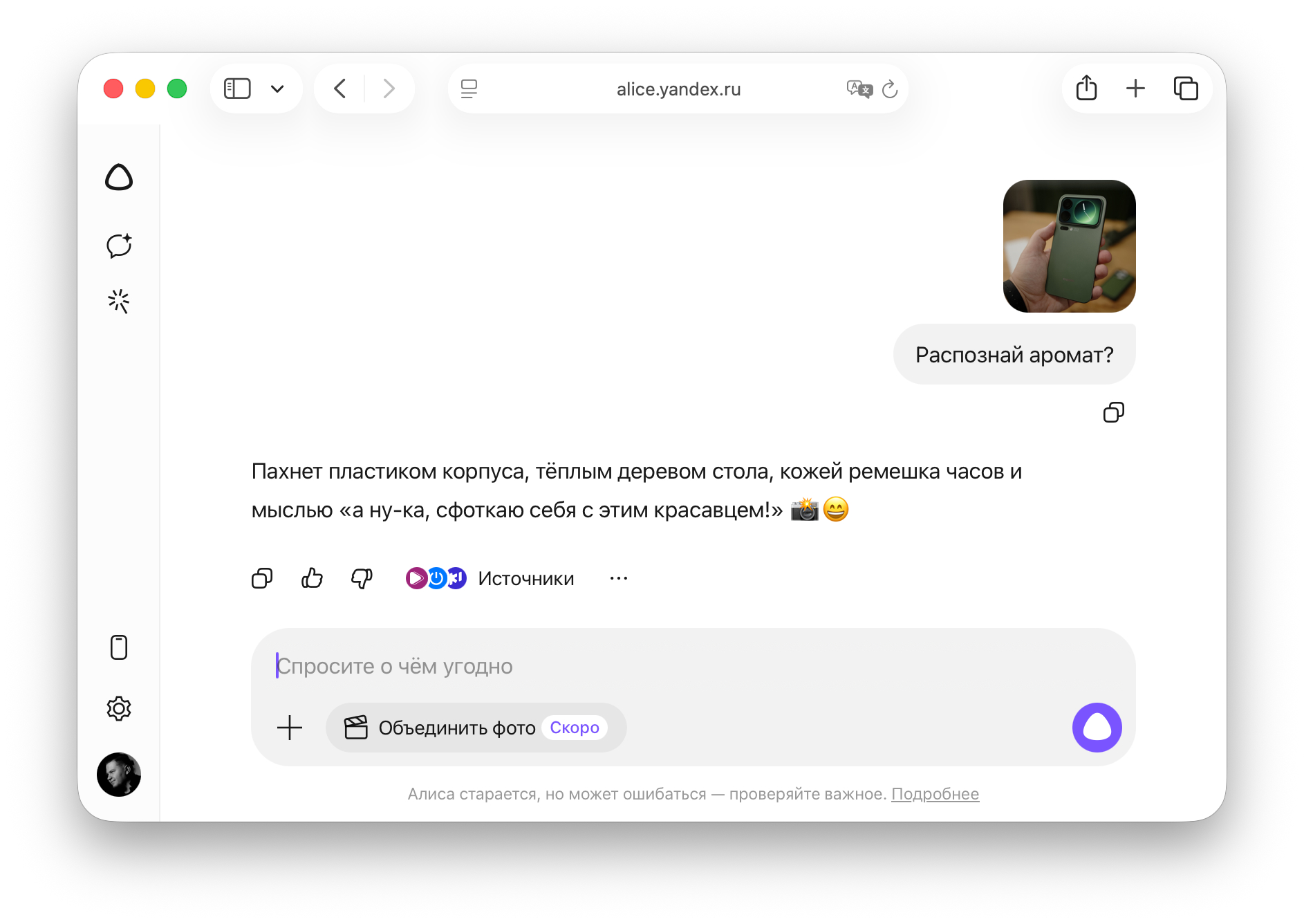 Анализ запаха по изображению уже доступен в мобильном приложении и веб-версии «Алисы». Только умоляем вас, не просите её распознать аромат топлёных сникерсов.